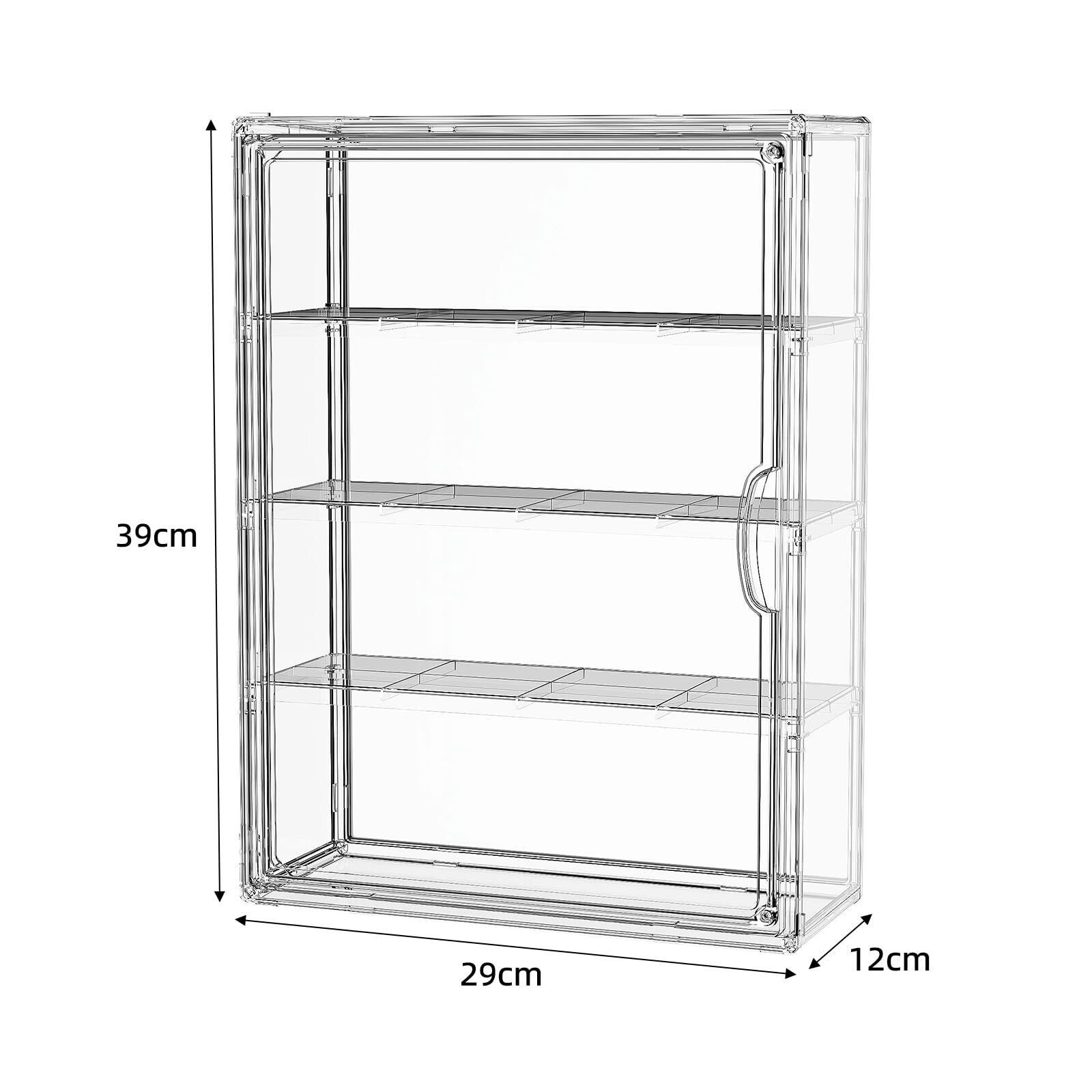 【便利な設計】このディスプレイケースは、自由にレイアウトできる可動式棚板(3枚付属)で、収納物に合わせてスペースを調整可能。90度開閉可能なマグネットドア、片手でもスムーズに収納物の出し入れができます。重ねてもずれない溝加工で、安定した積み重ねが可能。