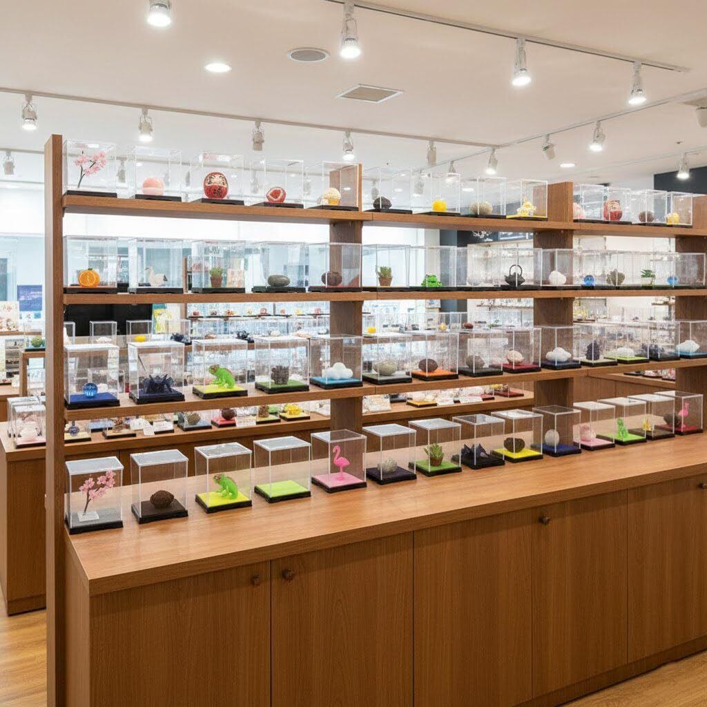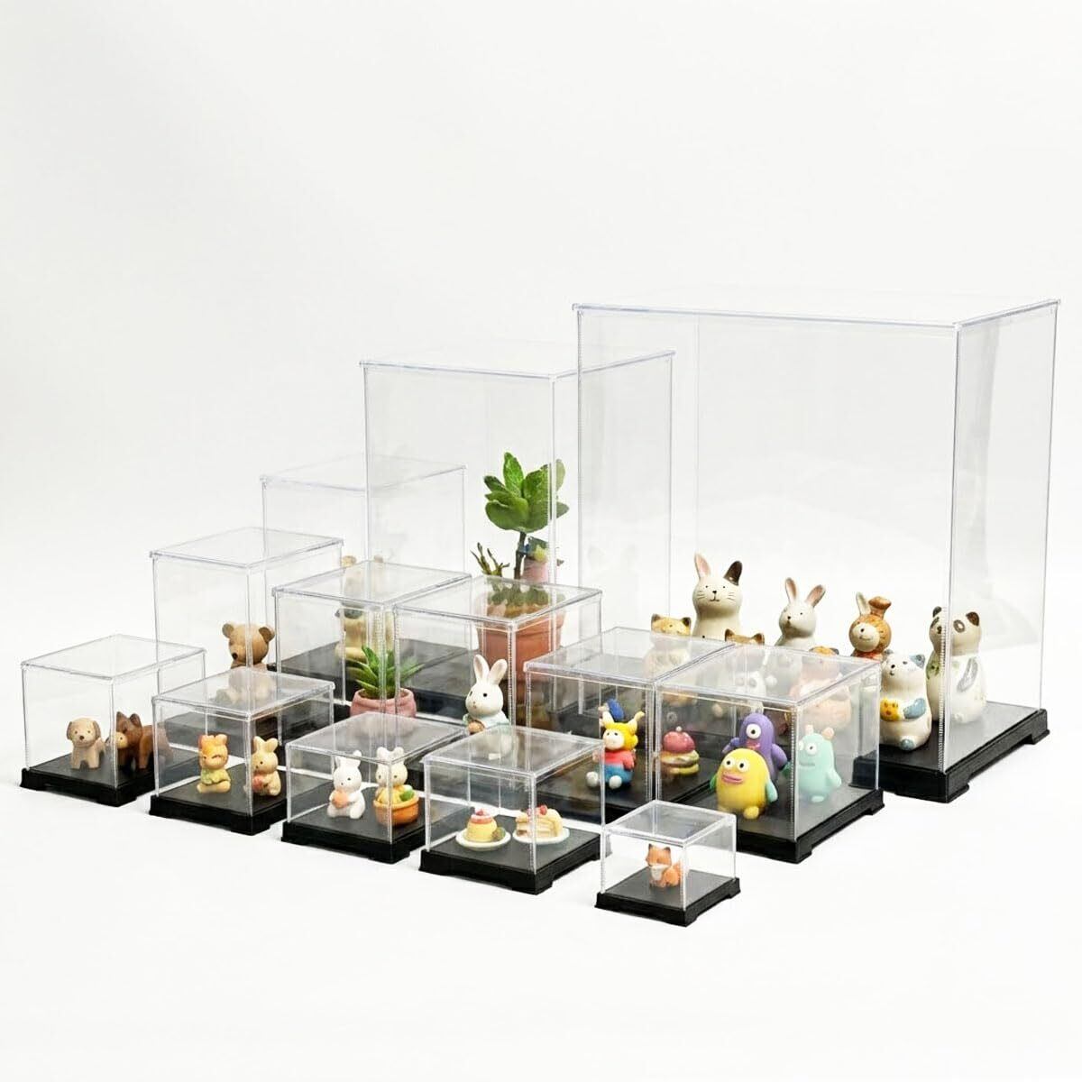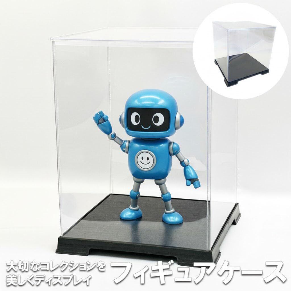 コレクションケースは底板(黒色厚さ約1mm)及び天板(透明)はプラスチック(厚さ約1mm)、側面(周囲)は透明のプラスチックシート(塩化ビニール厚さ0.35から0.5mm)で形成されています。