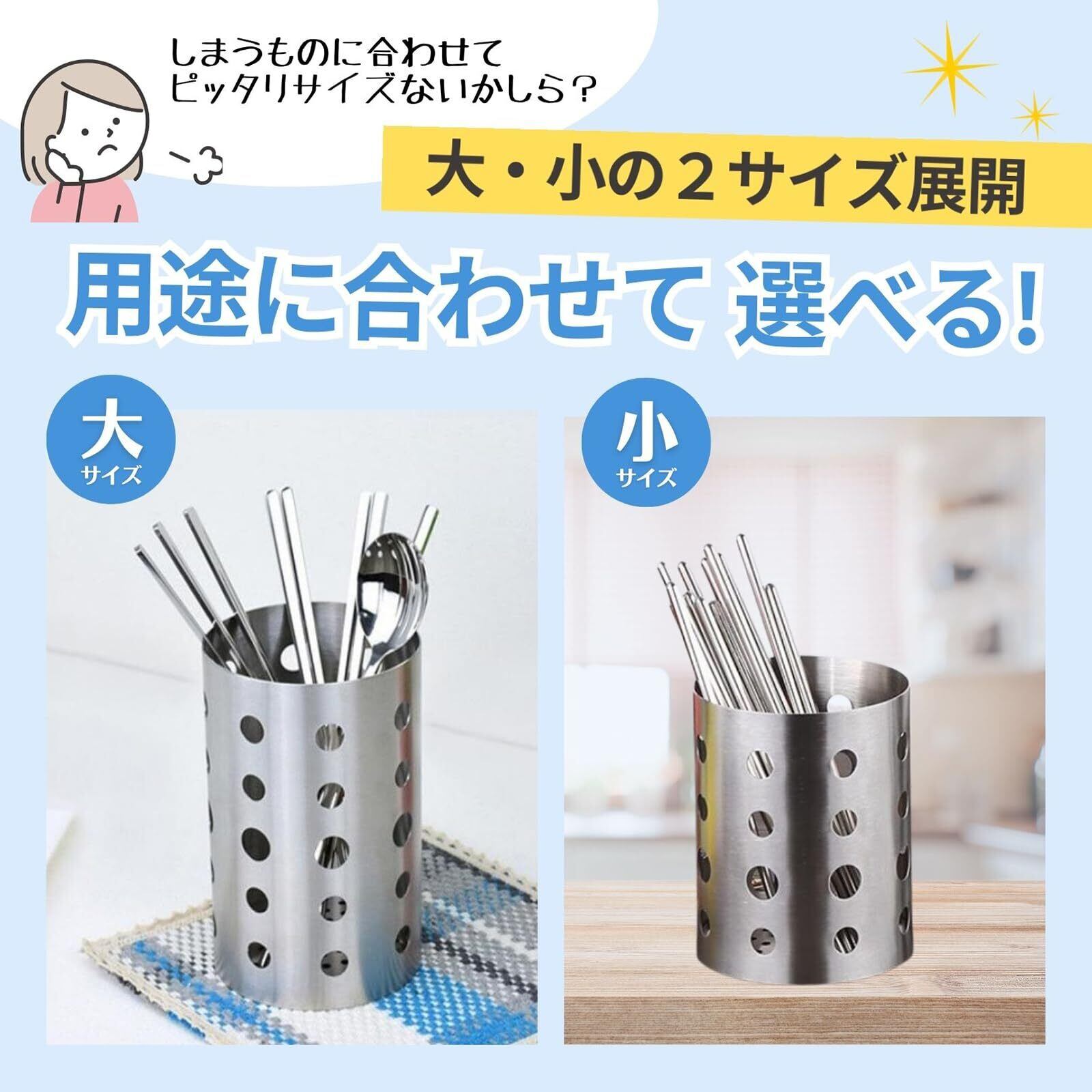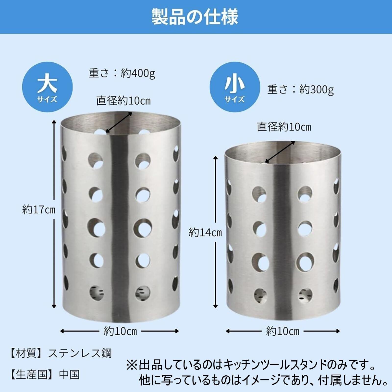 サイズ(約):大 幅10×奥行き10×高さ17cm 小 幅10×奥行き10×高さ14cm 重さ(約):大 400g 小 300g 材質:ステンレス鋼 ※洗う時など、筒の上部やパンチングの穴でお手を怪我されないようご注意ください。