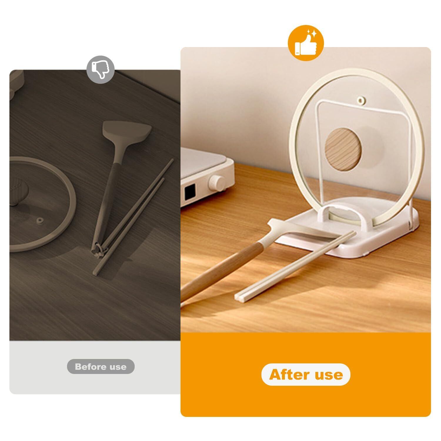 【鍋蓋スタンド】おたまたて調理中のちょい置きに便利。置き場に困るお玉や菜箸を立てて収納。お玉以外の小物(菜箸・ターナー・ヘラ・トング・しゃもじなど)や鍋蓋・フライパンカバーも立てて収納可能。キッチン周りを清潔に保ちます。