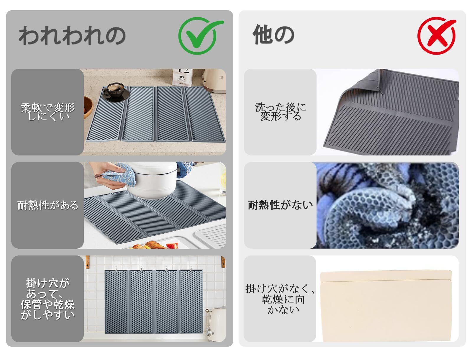 スリップ防止と耐熱性:滑りにくい素材で、キッチンの湿った環境でも安定して使用できます。耐熱温度が高く、熱い食器や調理器具を直接載せても問題ありません。