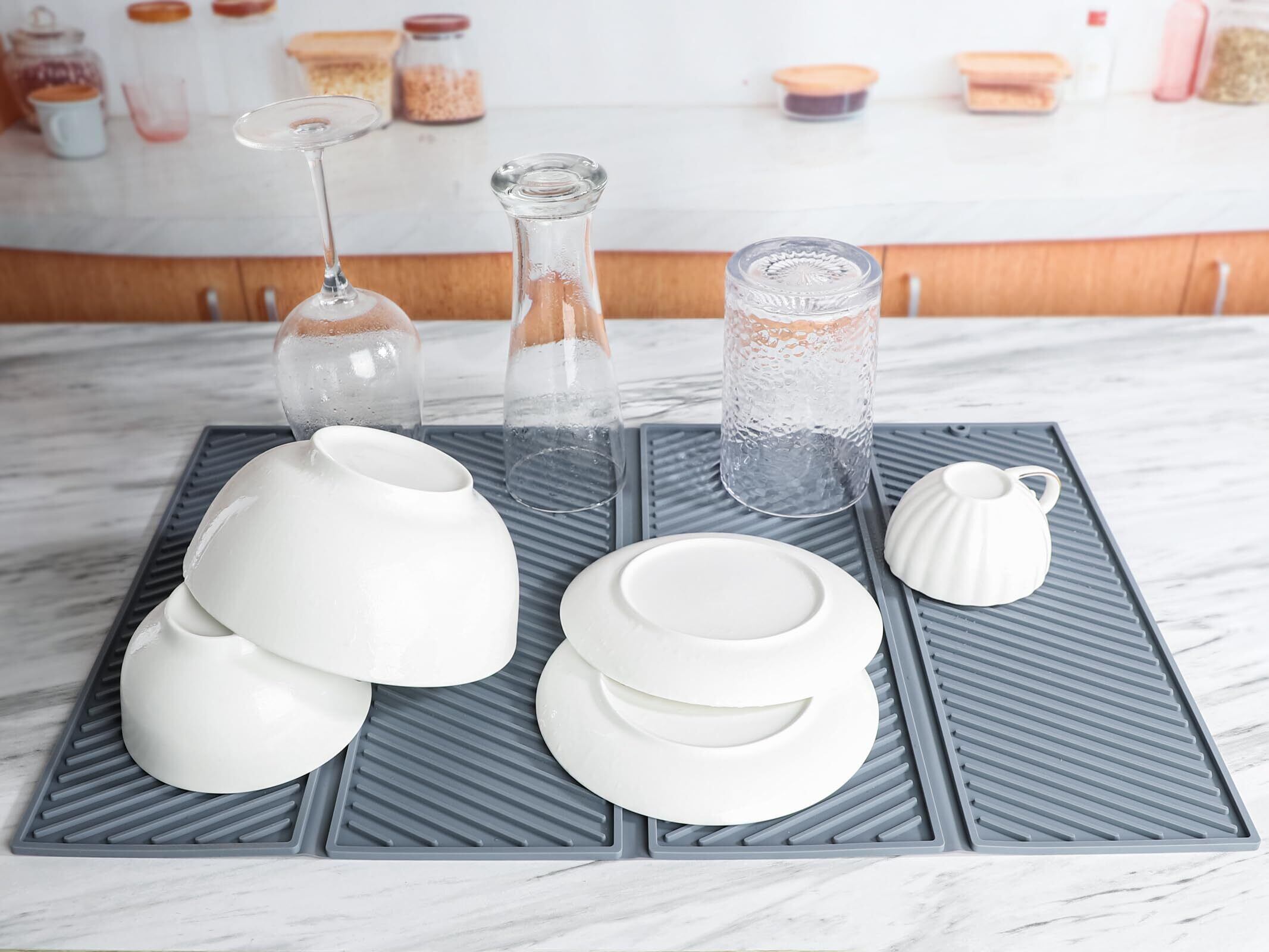 多機能:この水切りマットは、キッチンカウンターやシンク横での食器乾燥以外にも、防汚マット、耐熱マット、コーヒーポットマットなどとしても使用できます。さまざまなシーンでキッチンの利便性を格段に向上させます。