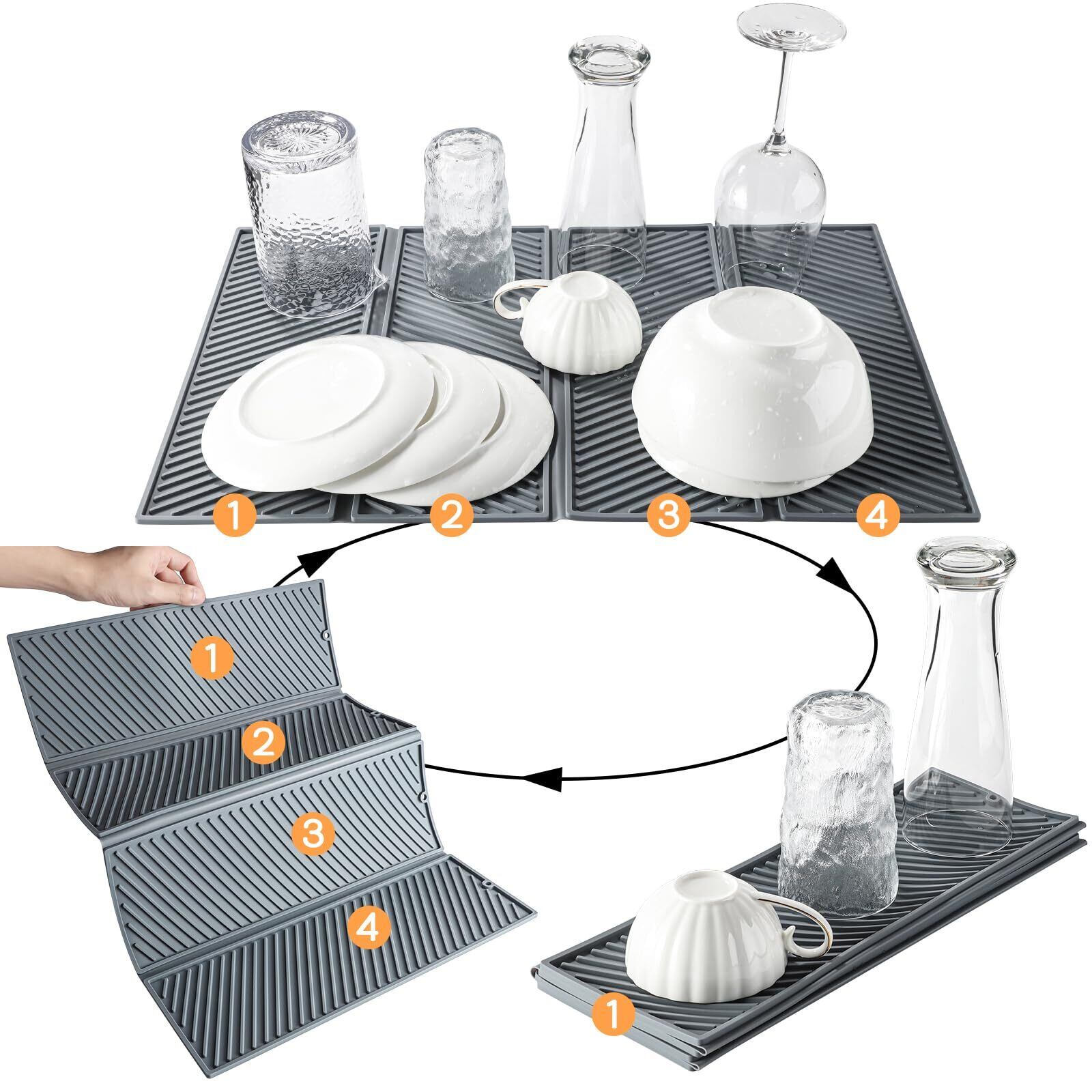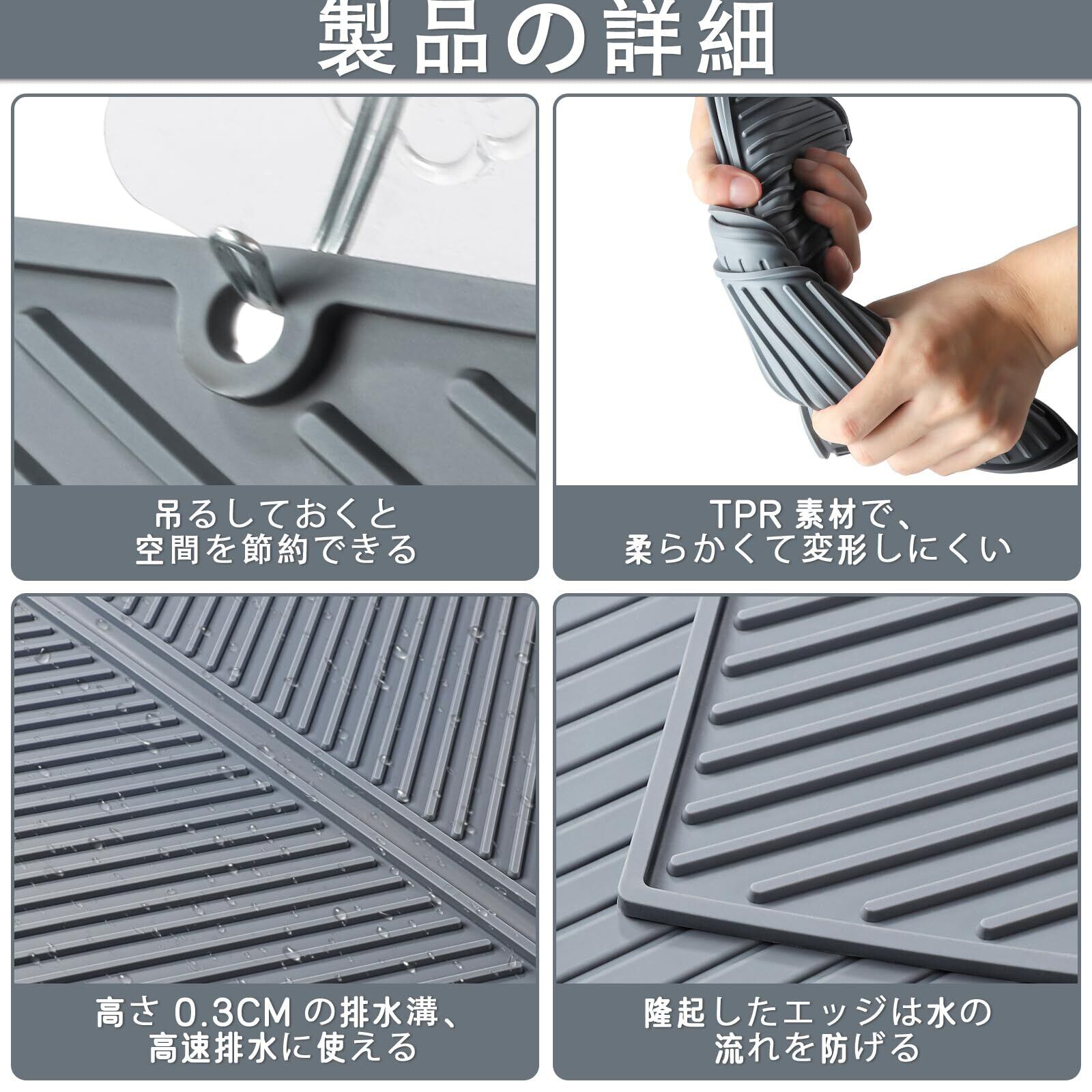 シリコン製水切りマット:このシリコン食器乾燥マットはシリコン素材を使用しており、サイズは約 60cm×45cmです。洗い上げた食器やグラス、鍋、フライパンなどを自然乾燥させるための便利なスペースを提供し、カウンタートップを乾燥かつ清潔に保ちます。