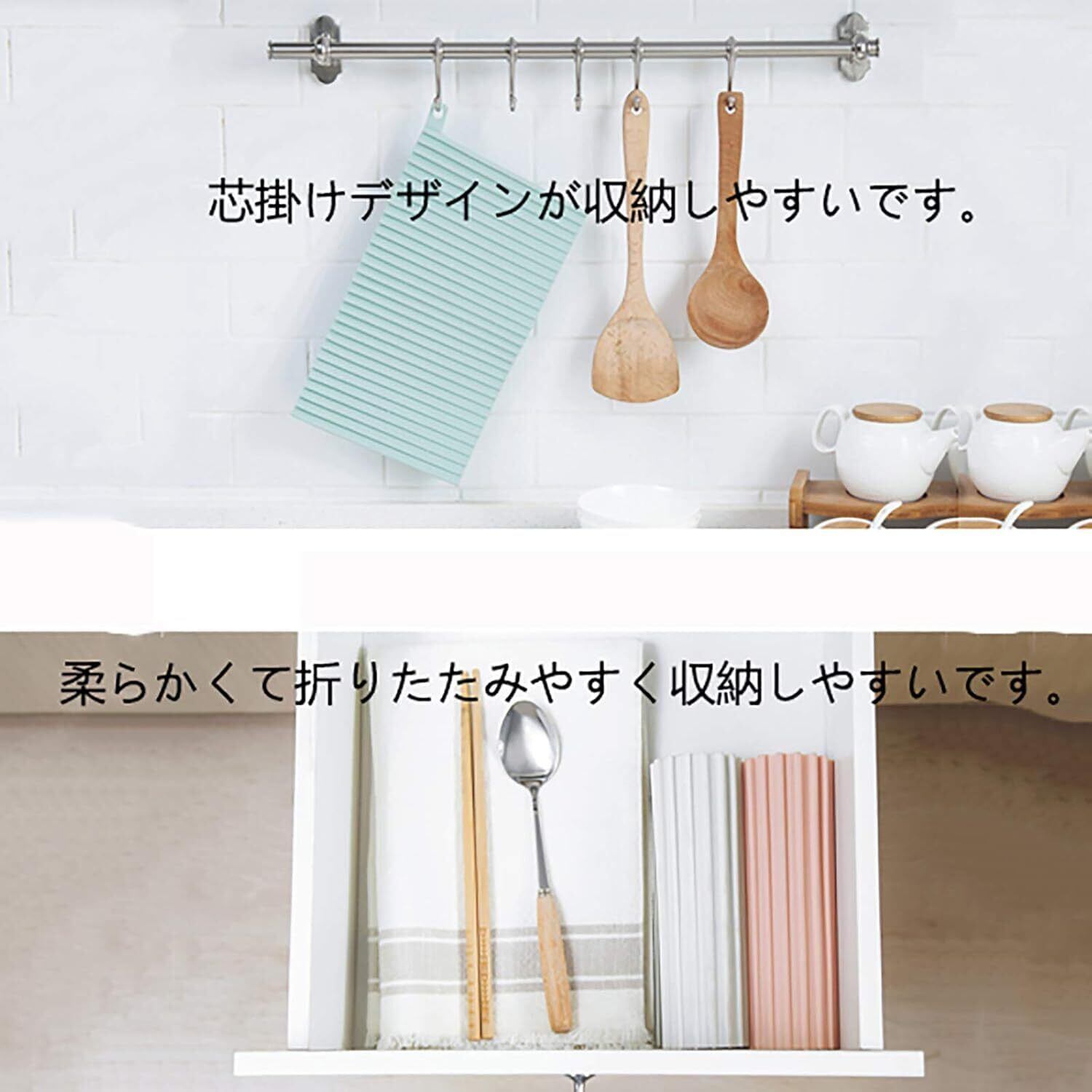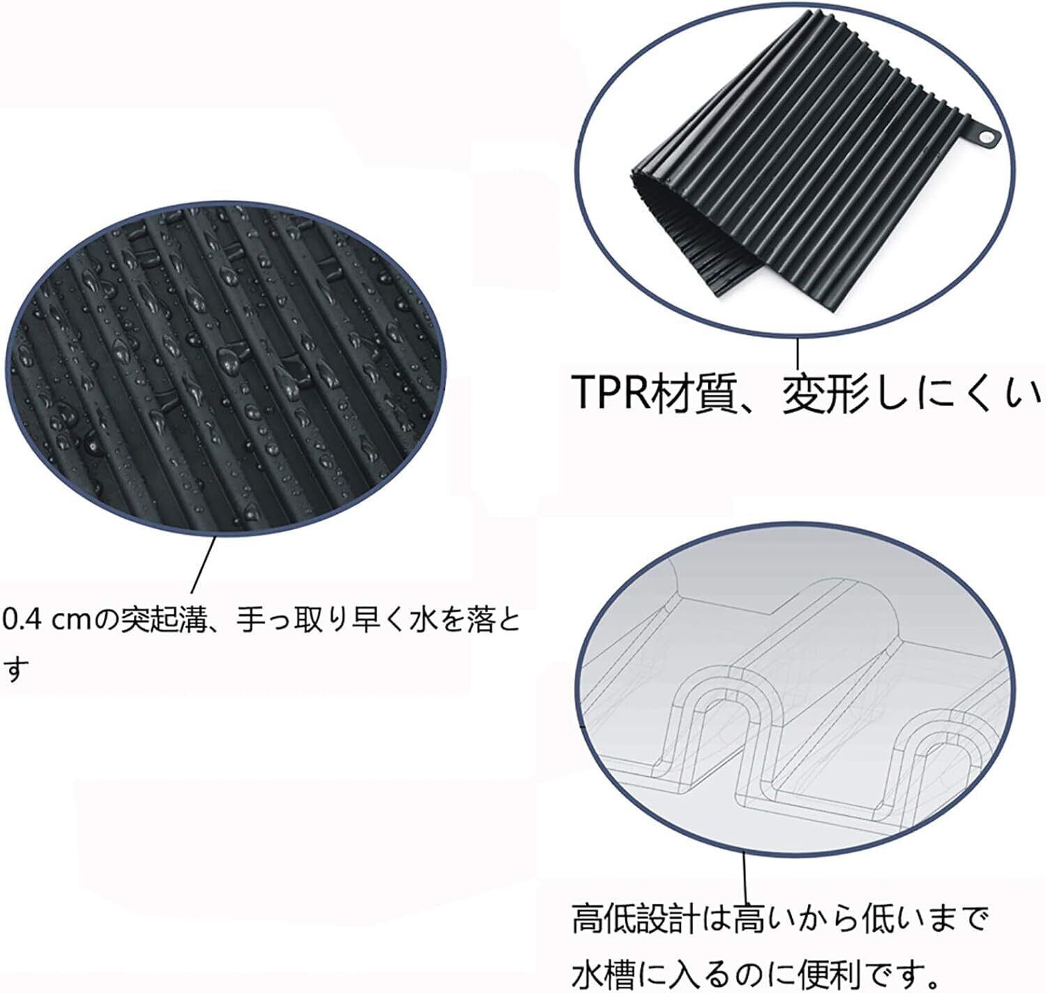 お手入れ簡単:このシリコーン水切りマット洗濯不要で、マット自体乾きやすいので、風通しが良いところに立てかけておけばカビの心配もなくなりました。また、シリコン製の水切りマットは吸水性がないため、キッチンは水漏れでこぼれません。通常、布製の水切りマットは濡れていて、カビが生えやすいため、清潔を保つためにこまめに洗う必要があります、しかも、乾くのに時間がかかります、掃除が苦手な人は面倒だと感じていたでしょう。