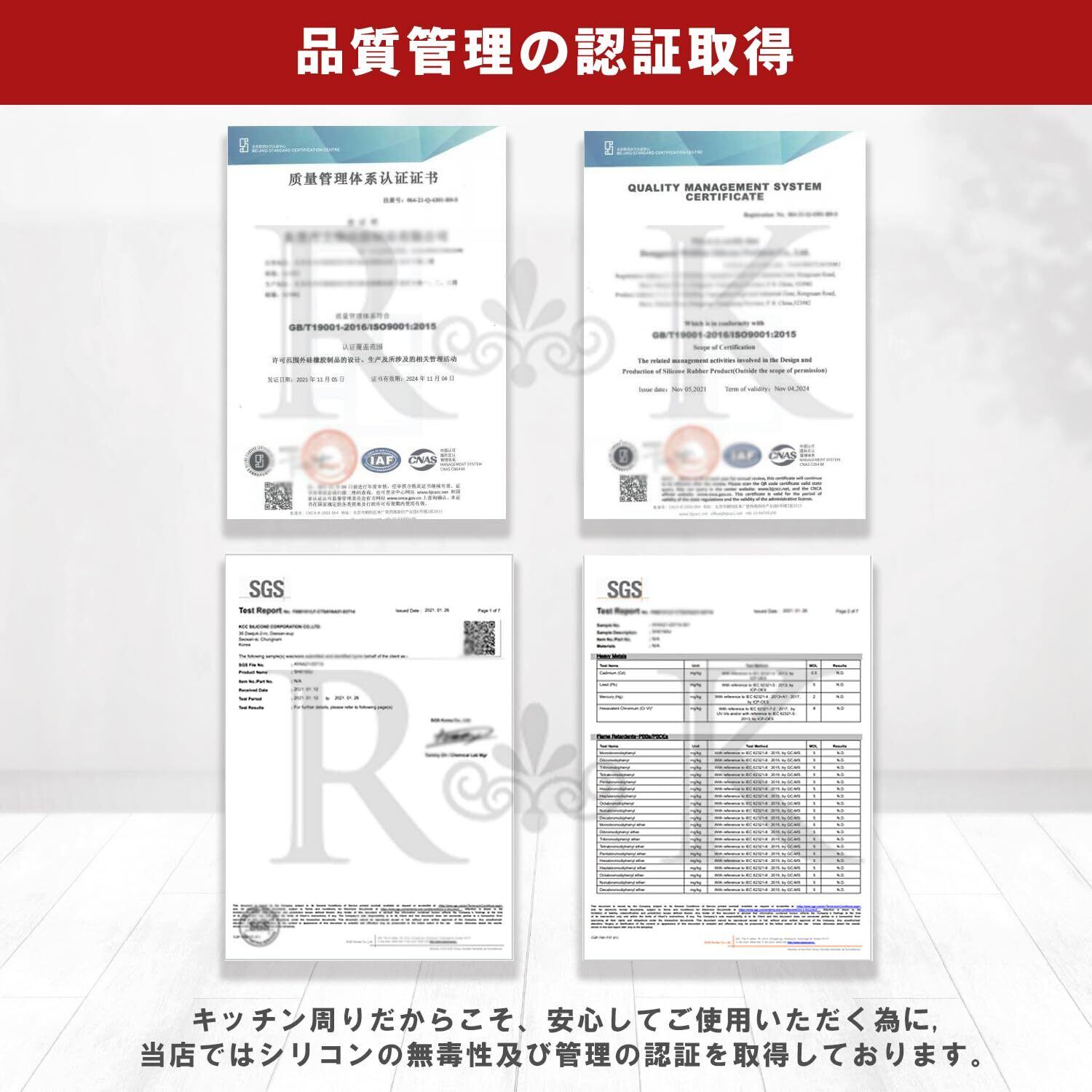 シリコン100%で品質管理の認証取得:キッチン周りに使う商品だからこそ、品質管理に気をくばり製造しておりますので、安心して長く使える優れモノです。