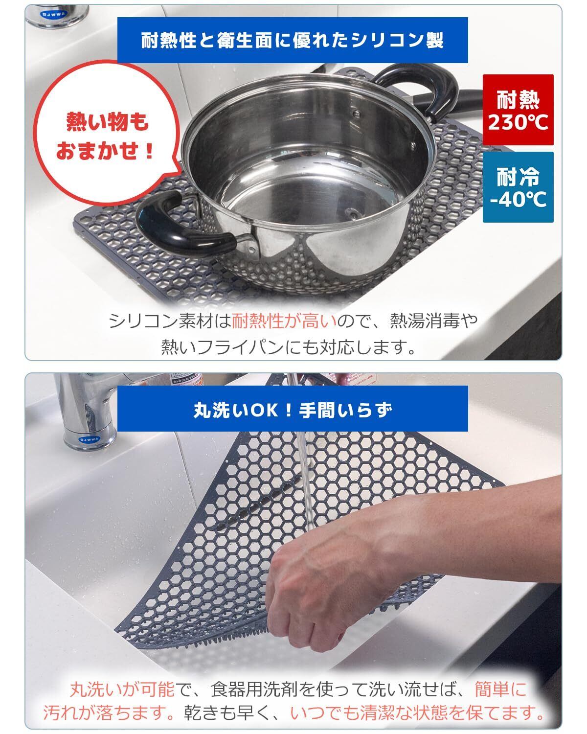 耐熱温度は高温230℃まで対応:低温は-45℃に対応している為、使ってすぐの鍋や保温誤の炊飯器の窯を置いたり、氷や冷たい水が入った容器を置いても大丈夫。