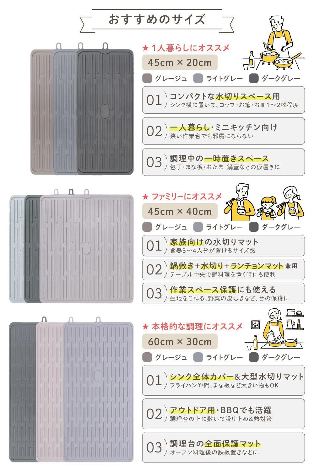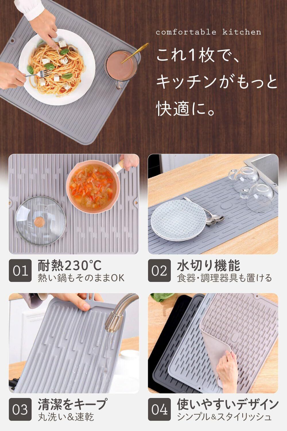 【シリコン素材でお手入れ簡単&衛生的】 シリコン素材なのでサッと水洗いするだけで汚れが落ちやすく、いつでも清潔に保てます。食洗機も対応◎忙しいキッチンでの家事効率もアップします。期間の繰り返し使用にも耐える耐久性もポイントの水切りマットです。