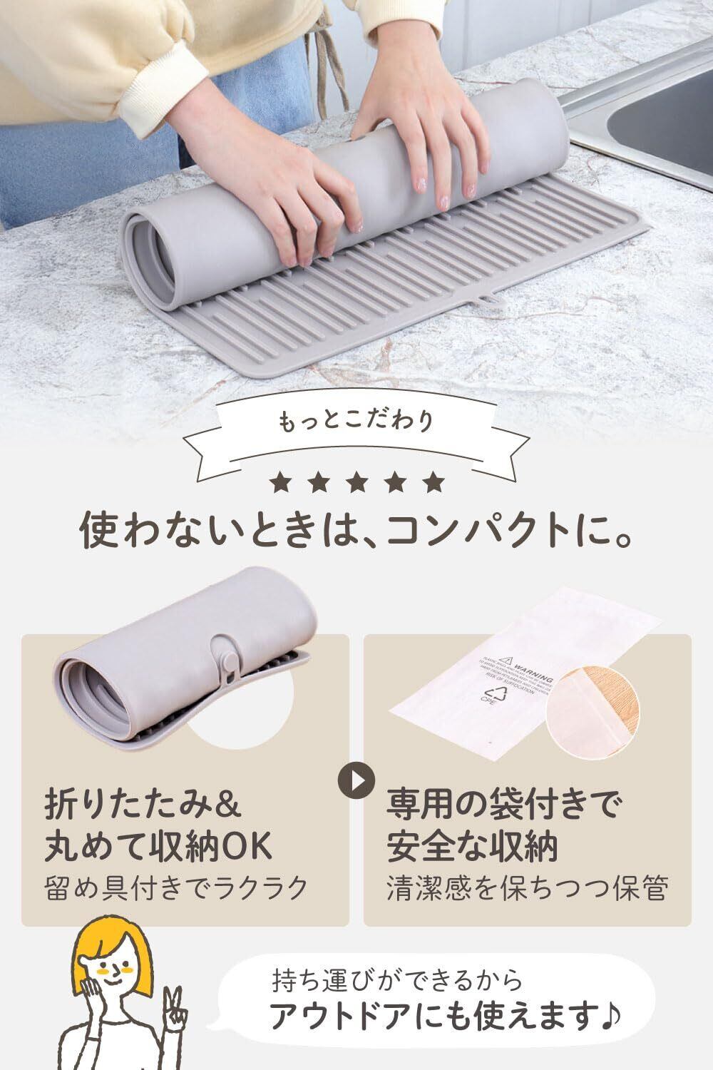 【省スペース設計で使わない時も邪魔にならない】 柔らかくてしなやかなシリコン素材なので、使い終わったらクルクルと丸めて省スペースに収納可能。取り扱いが簡単で、引き出しにもスッと収まります。使いたい時にサッと取り出せて便利な水切りマットです。
