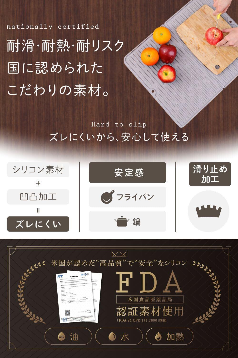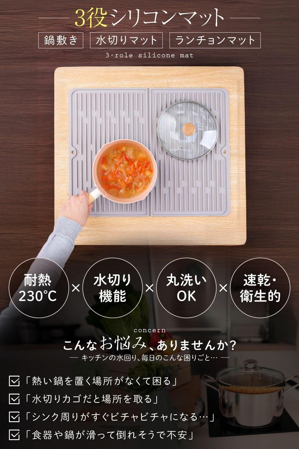 【耐熱仕様で鍋敷きとしても】 230度まで耐えられる耐熱設計で、鍋敷きやフライパン置きとしても活躍します。テーブルの焦げや変色を防ぎ、キッチン作業中の一時置き場として便利な多機能で使い勝手の良い耐熱シリコンマットです。