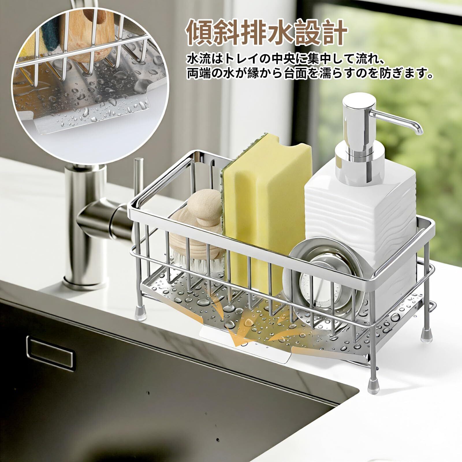 【取り外し可能な排水トレイ】傾斜構造の水切りトレイで、水はけを促進しスポンジを素早く乾燥。簡単に取り外して洗えるので、カビや汚れの蓄積を防ぎ、清潔を保てます。