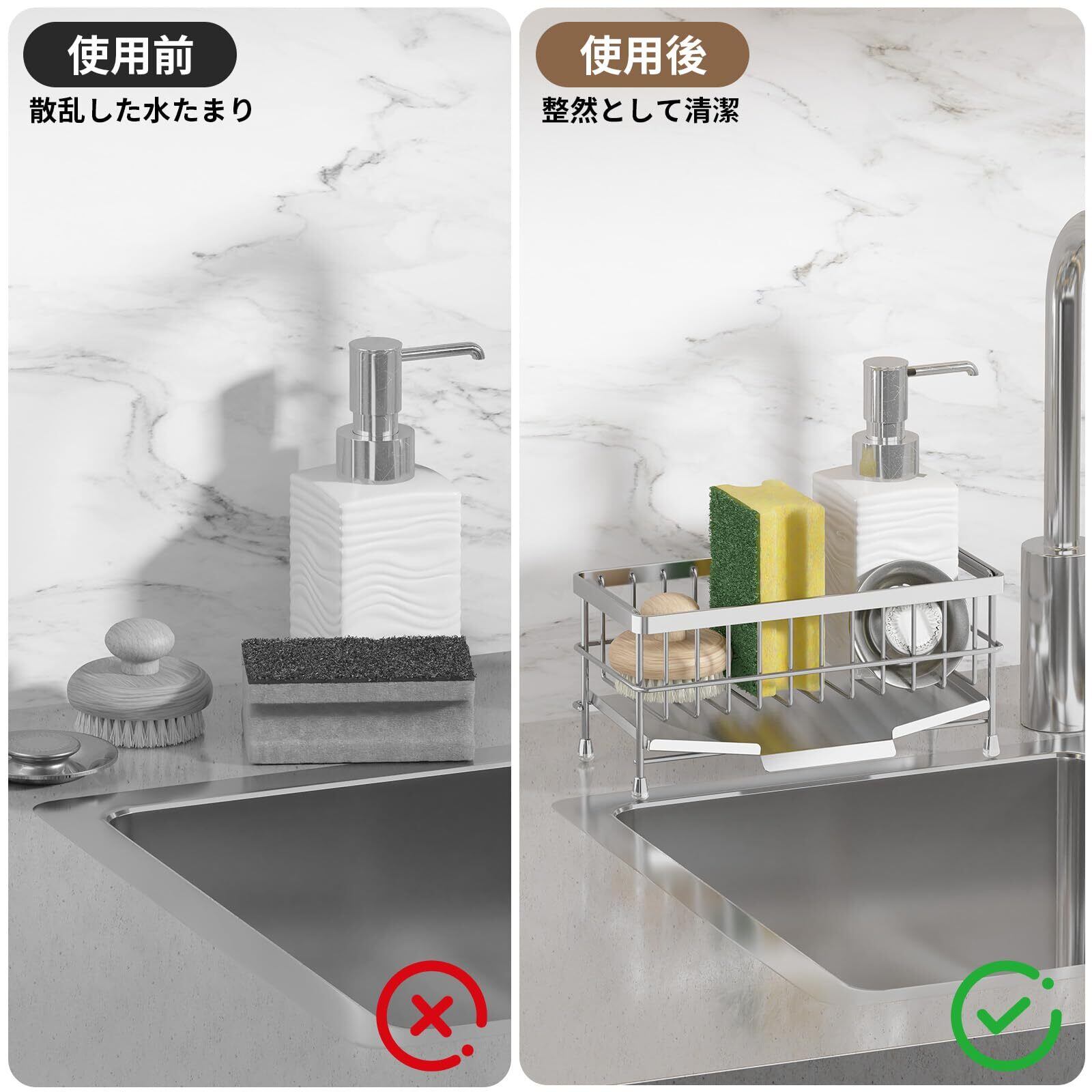 【コンパクト設計】スポンジホルダーのサイズは約21cm(幅)×10cm(奥行)×9.5cm(高さ)、キッチンシンク周辺の狭いスペースに適です。流し台の周りのスポンジ、食器用ブラシ、洗剤などを整理整頓し、限られたスペースを効率的に活用できます。