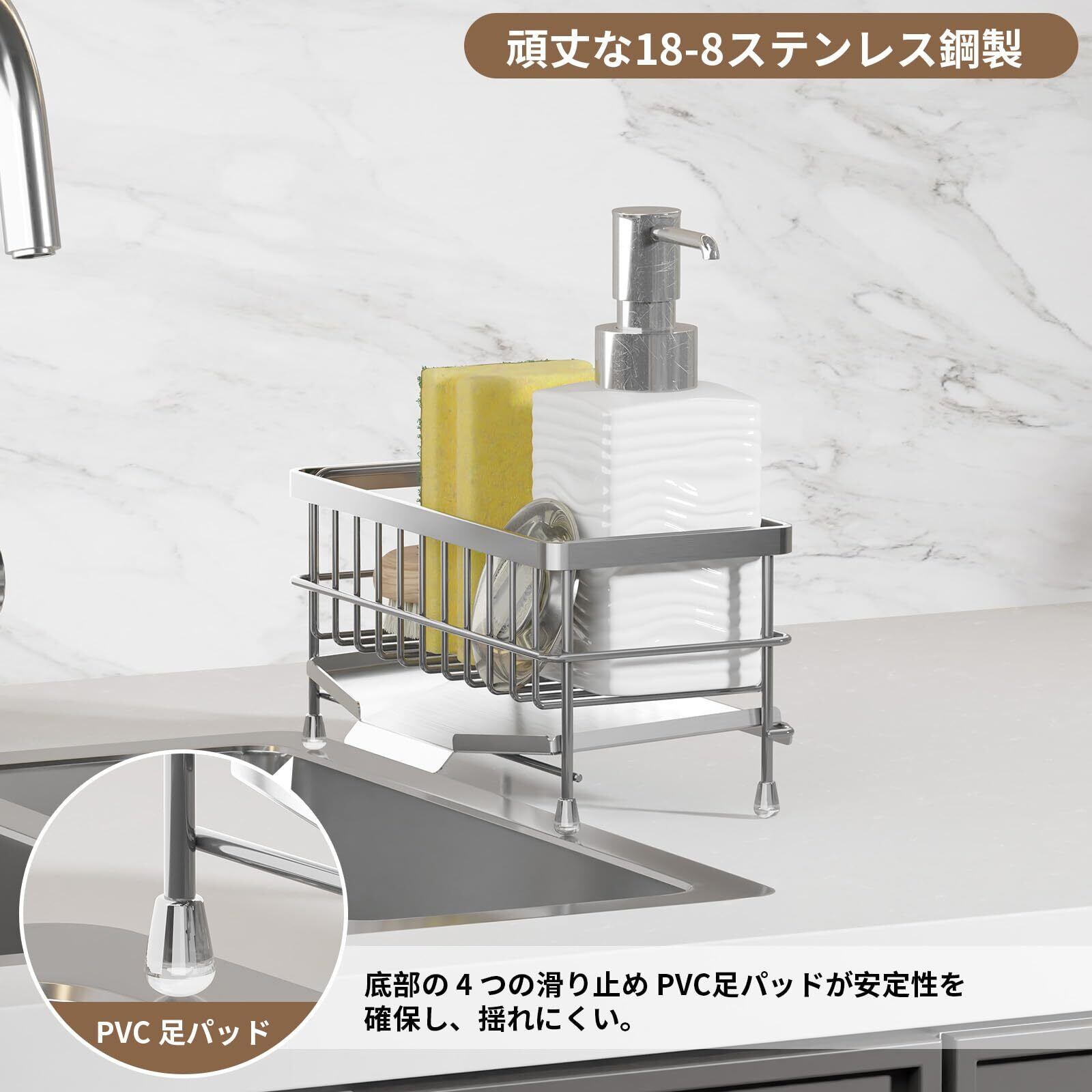 【頑丈な18-8ステンレス】PAVSTINEのキッチンスポンジラックは、耐久性に優れた18-8ステンレス鋼を採用。防錆性、耐腐食性、耐熱性に優れ、キッチンの湿った環境でも錆びず、長期間使用できます。