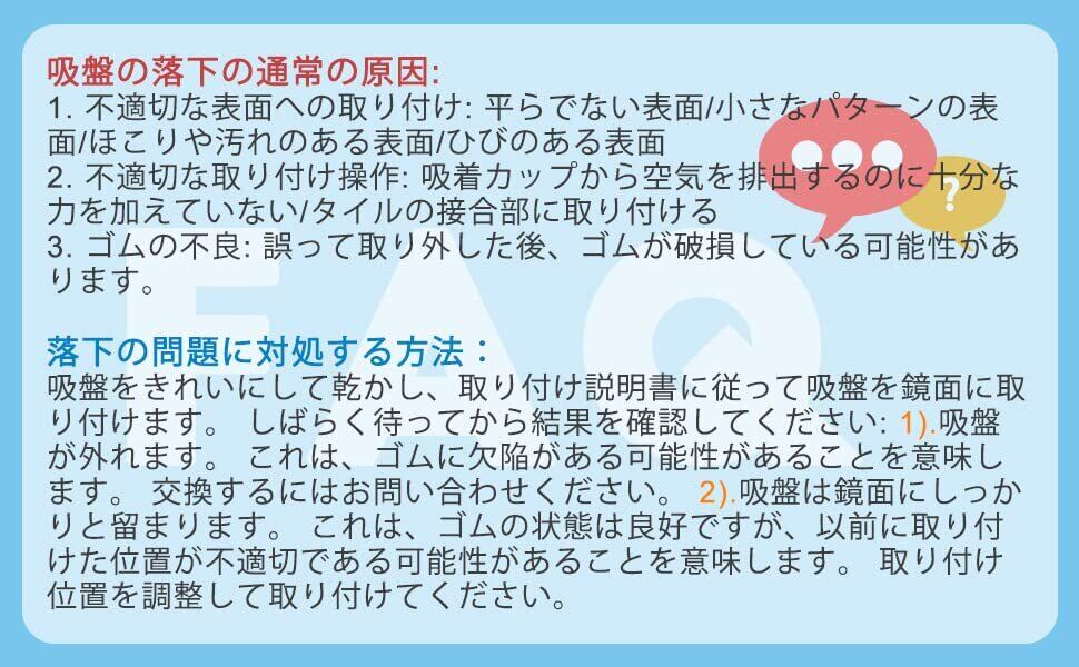 【簡単な設置】壁に穴を開けたり、他の工具を使って製品を設置する必要はありません。設置手順に従って、数分以内に壁に設置します。吸盤は壁面にダメージを与えず、取り外しても跡が残りません。