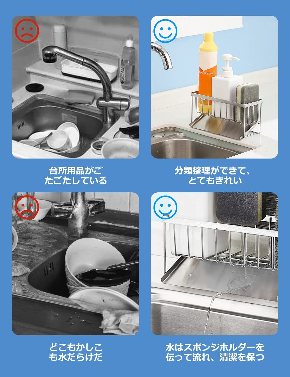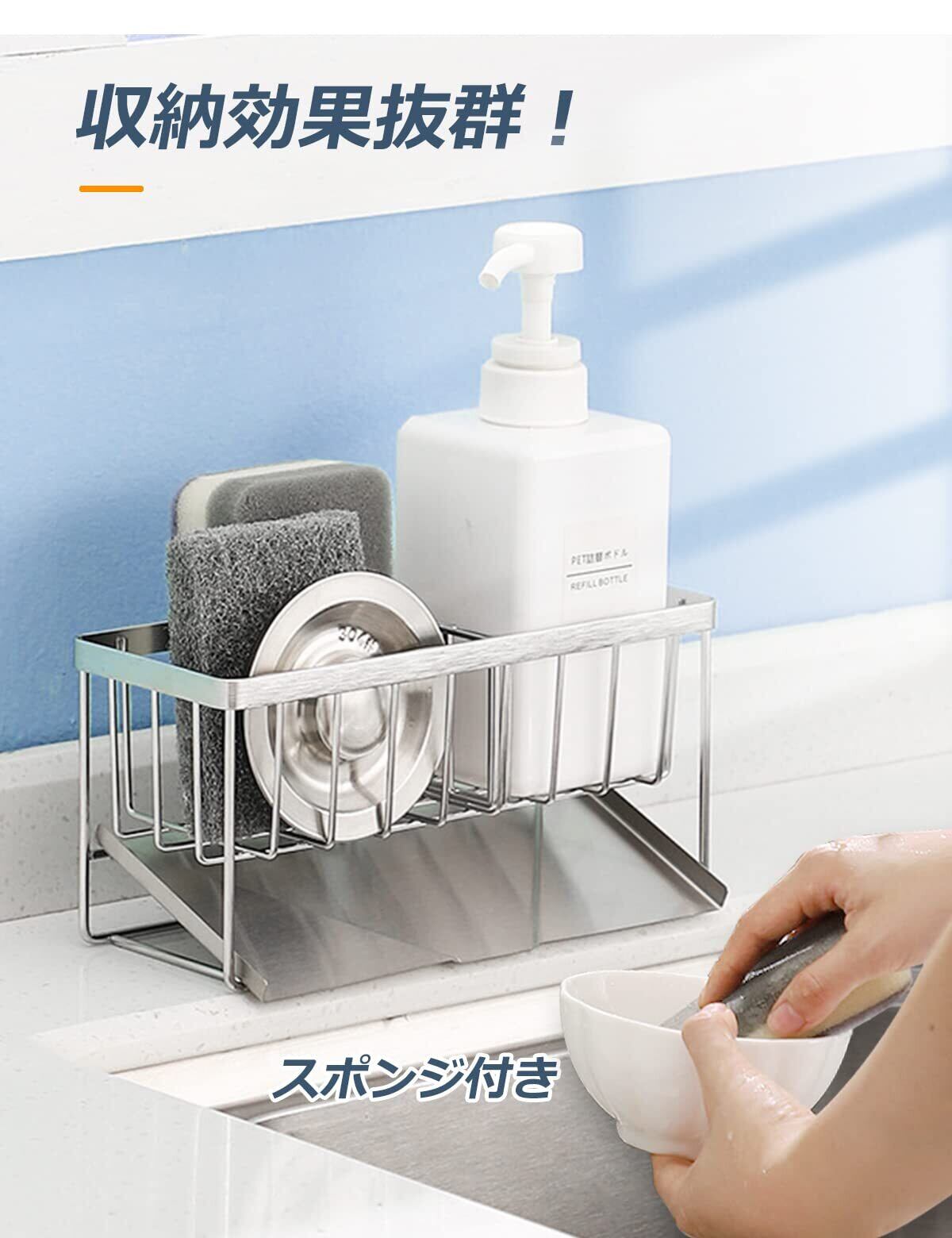 【高品質なステンレス素材】スポンジラックは高品質な304ステンレス素材を使用しており、通常のステンレスに比べて防錆性、耐熱性、耐食性などの性能により優れ、長時間使用してもストレスフリーになりません。