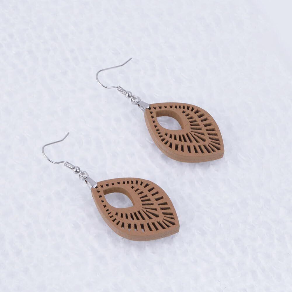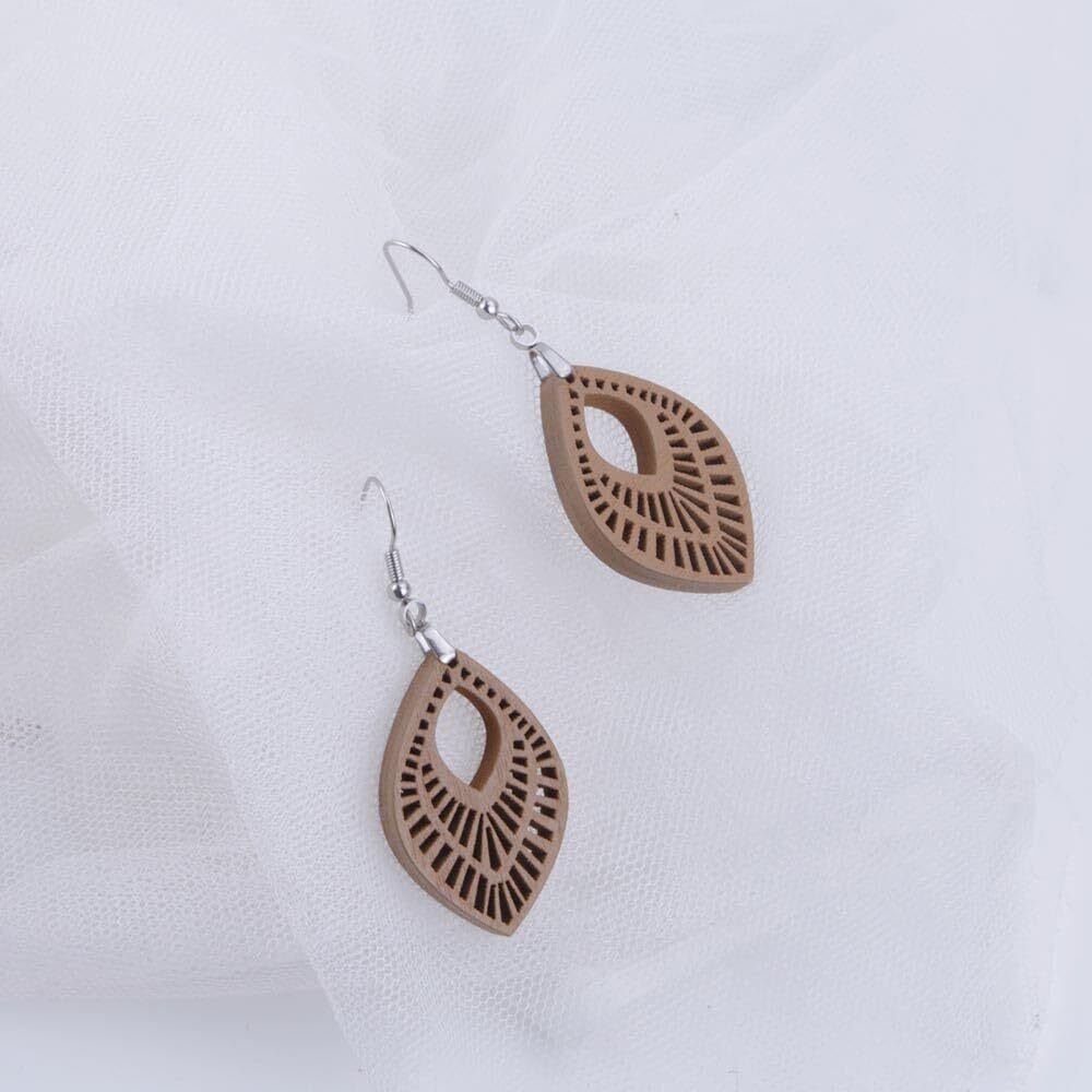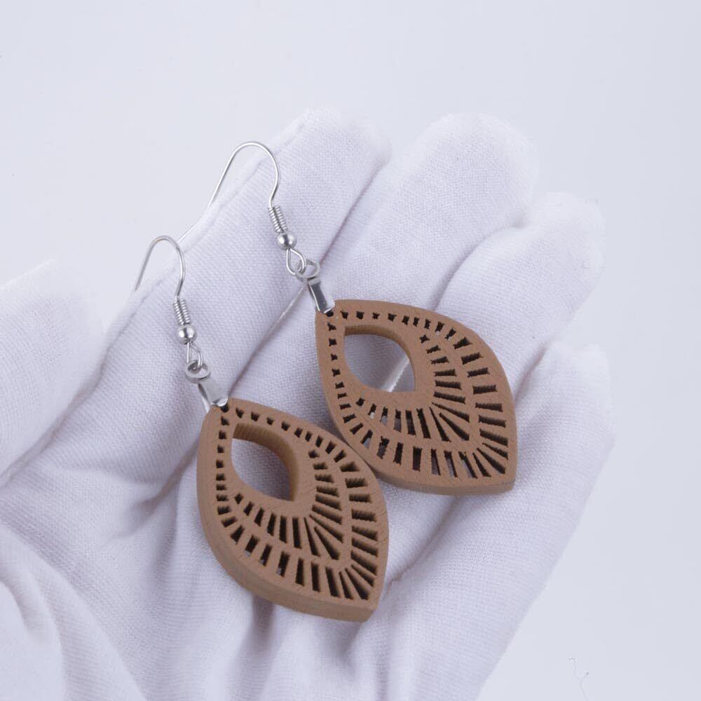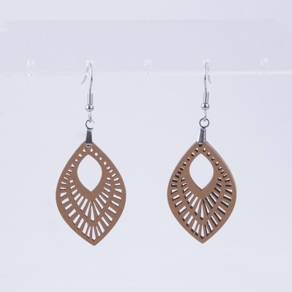 デザイン: ナチュラルな木の素材感を活かした彫刻模様が施され、洗練されたリーフ型デザインで耳元にアクセントを加えます。カジュアルからフォーマルまで幅広く活躍します。