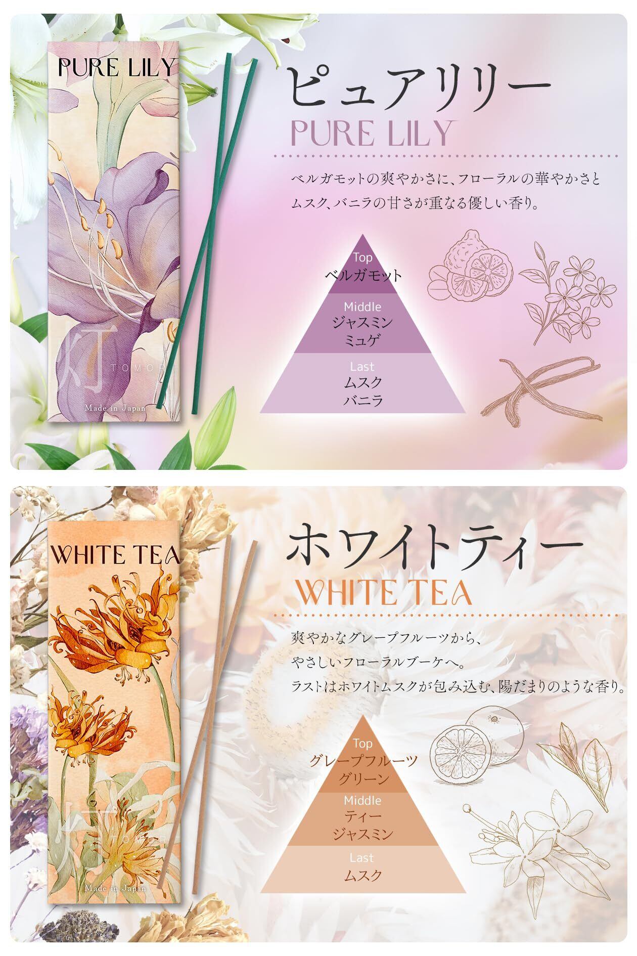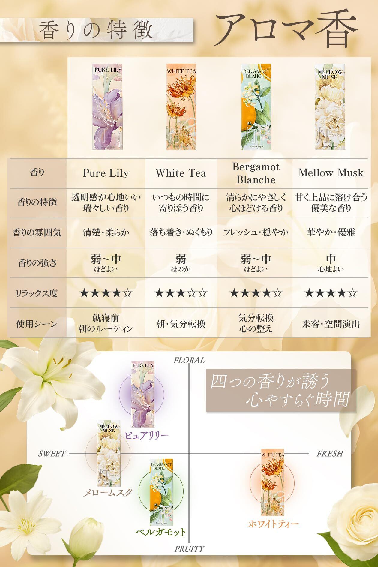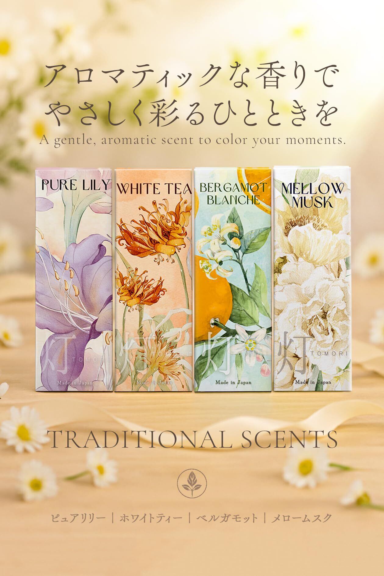 【4つの香りで日常に華やぎを】透明感あふれる「ピュアリリー」、甘く上品な「メロームスク」、陽だまりのようにやさしい「ホワイトティー」、清らかで爽やかな「ベルガモット」。それぞれ個性豊かな香りを気分やシーンに合わせて楽しめるアソートタイプ。お香初心者から香り好きの方まで幅広くお楽しみいただけます。