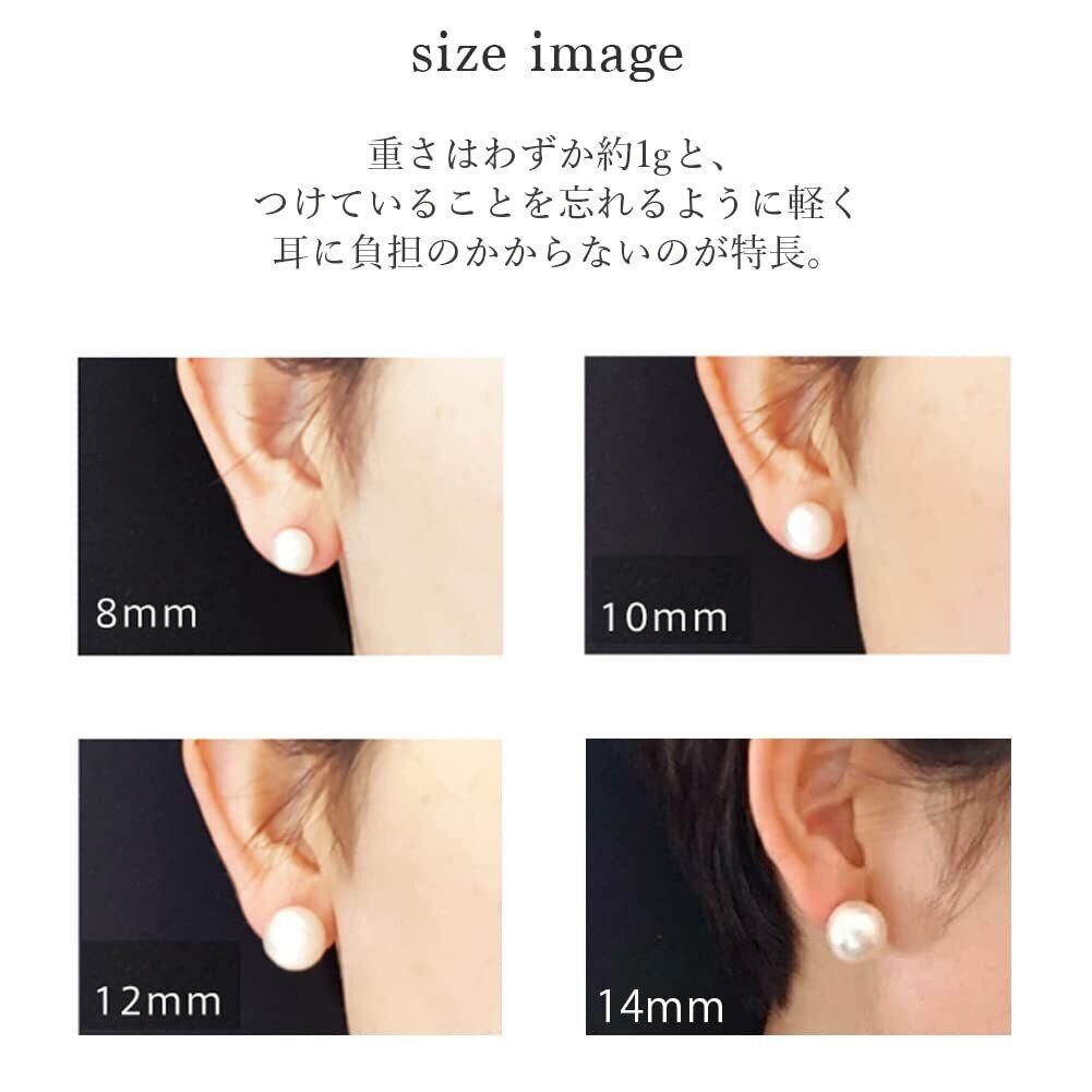 【軽いコットンパール】 重さはわずか約1g。つけていることを忘れるような軽さと優しい風合いが特徴的です。 耳への負担が少なく、「重いものを着けていると肩がこってしまう」という人にもおすすめです。コットンパールのサイズ:8mm、10mm、12mm、14mm