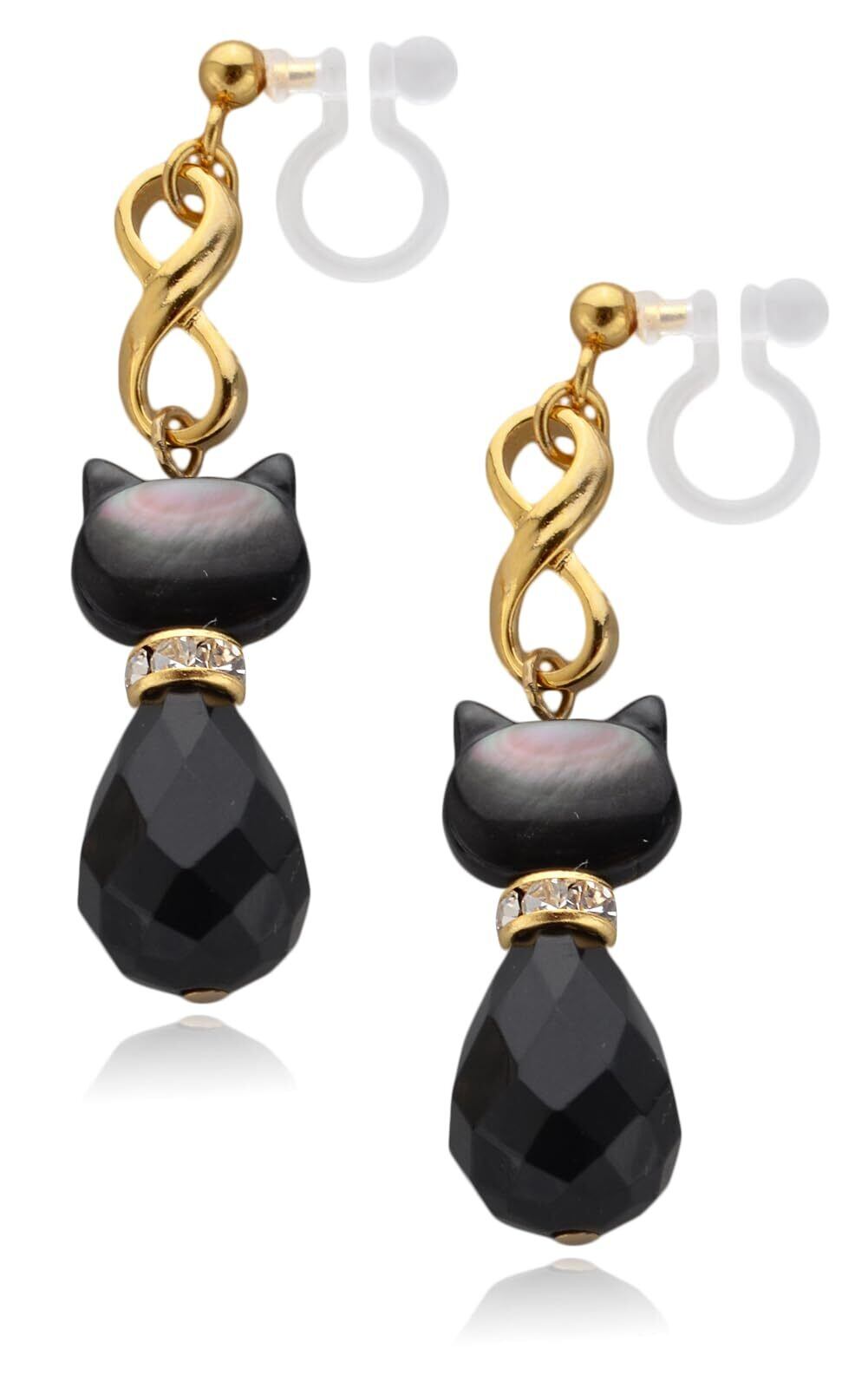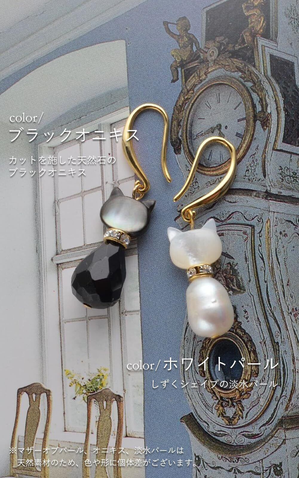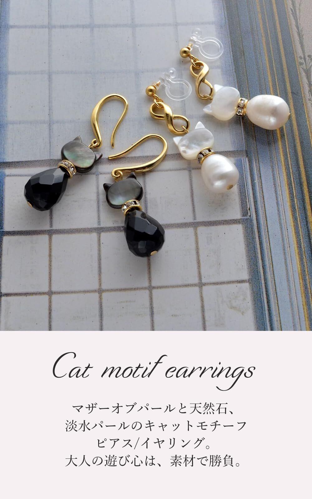 【遊び心のある猫モチーフ】虹色に輝くマザーオブパールとブラックオニキス、淡水パールのキャットモチーフピアス/イヤリング。虹色に輝く母貝(マザーオブパール)に、天然石、天然真珠を配して、愛らしいモチーフをきりっと引きしめて。大人の遊び心は、素材で勝負。