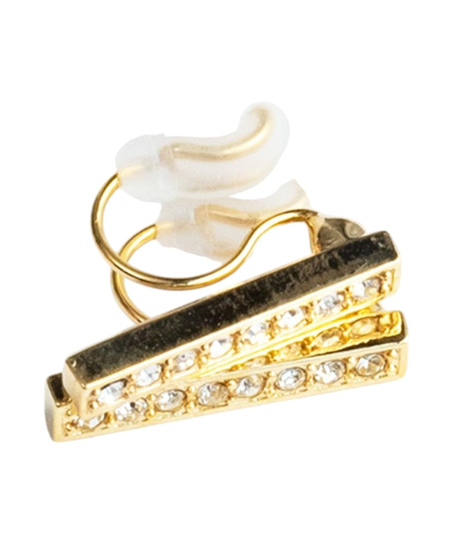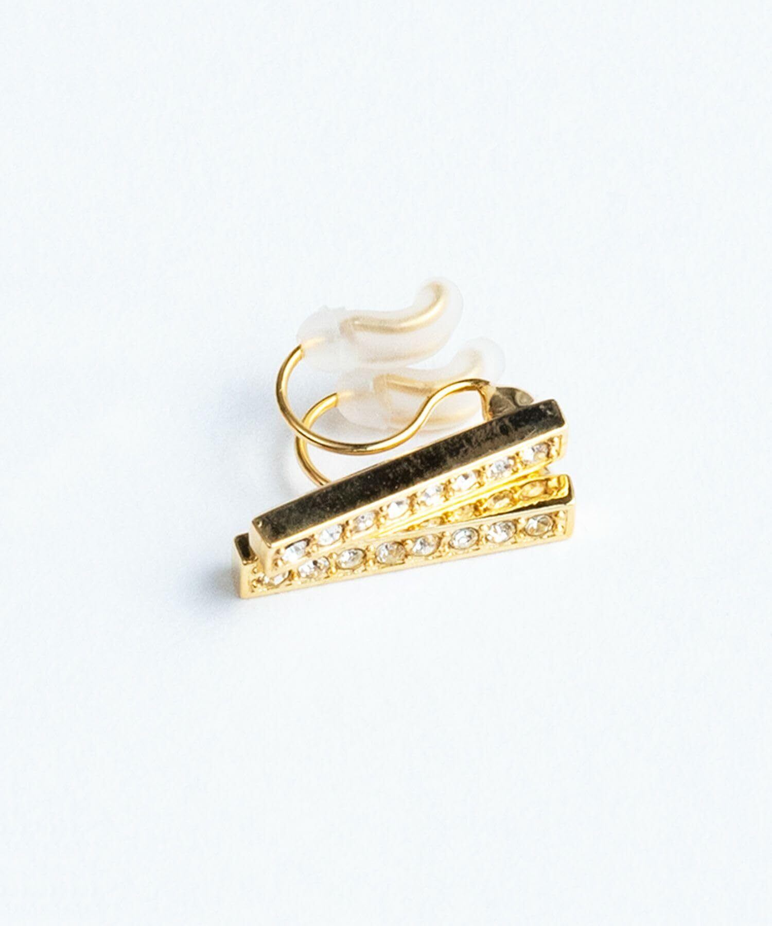 【キラキラ輝くイヤリング】ラインストーンがキラキラと輝き、大人っぽさを演出するイヤリング。普段使いは勿論パーティーシーンでも活躍するアイテム。付属のシリコンカバーがクッションになるため、長時間の着用でも痛くなりにくいのがポイント。華奢な金具を使用しているため、重たくならずピアスのようなスッキリとした印象に。