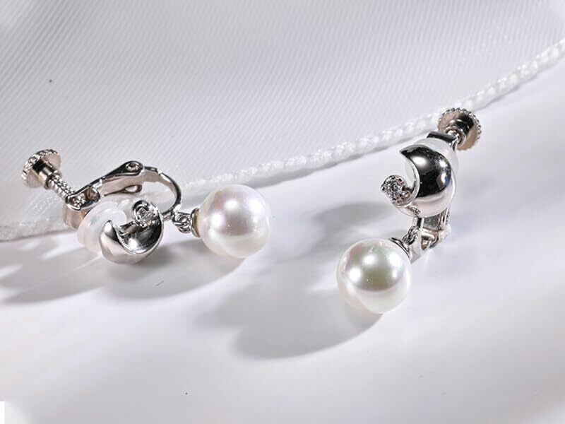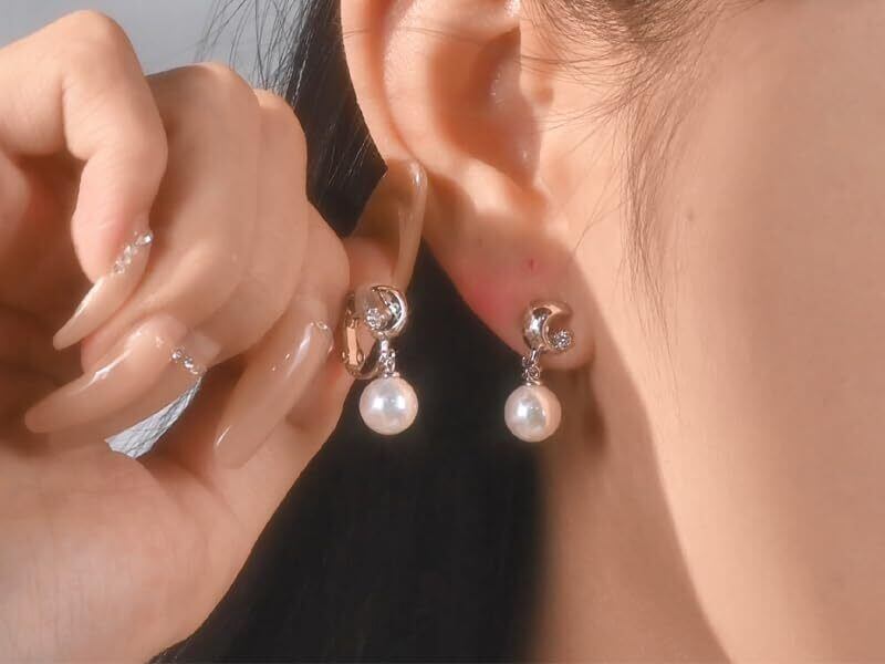月の輝き:三日月型にキラリと光るジルコニアをあしらい、その下にパールが優しく揺れる真珠イヤリング。パールは「純粋さ」の象徴で、身につける人に穏やかな魅力と落ち着きをもたらします