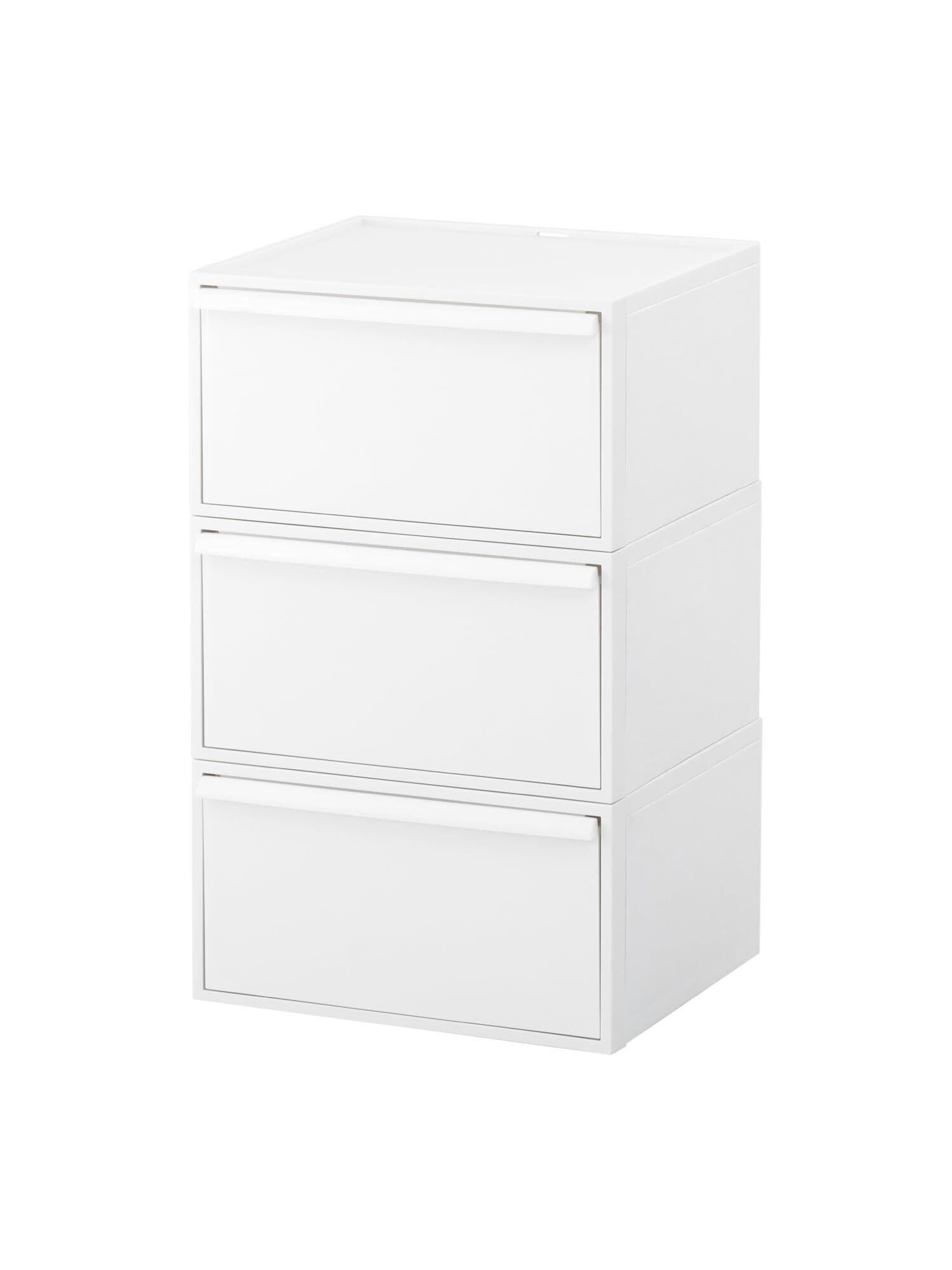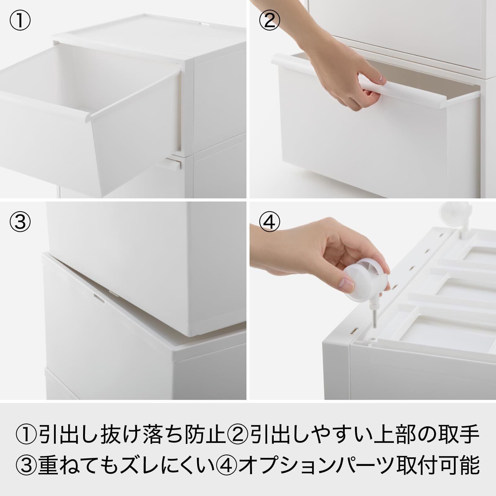・収納する物に合わせてサイズが選べる収納システム。物が増えたら買い足し可能で自由に組み合わせができます。 ・取っ手が引き出し上部に付いている為、下段の引出しを開ける際にかがむ負担を軽減できます。 ・中身が見えない為、中身を見せたくない収納に向いています。