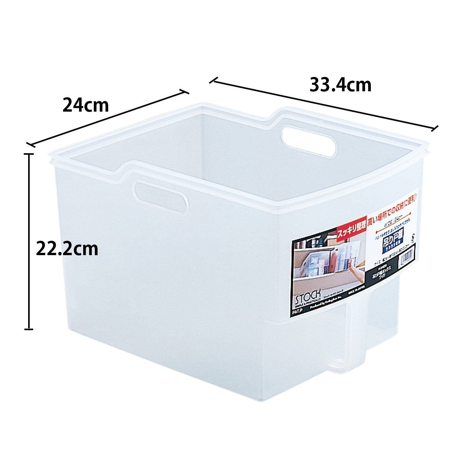 ●吊り戸棚など高い位置の収納に便利な収納ストッカー。●安定感のある太めのハンドル付きで出し入れが簡単です。●後部には傾斜がついており取り出し時、上の棚にぶつからずに取り出せるアイデア設計です。●側面には両手でも持てる取っ手付きです。●中身が分かりやすいクリアタイプ。●お手入れのしやすいポリプロピレン製です。●ワイドタイプです。