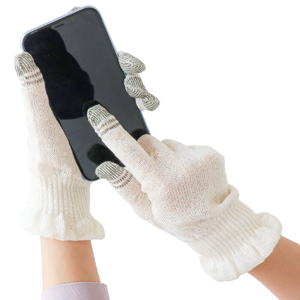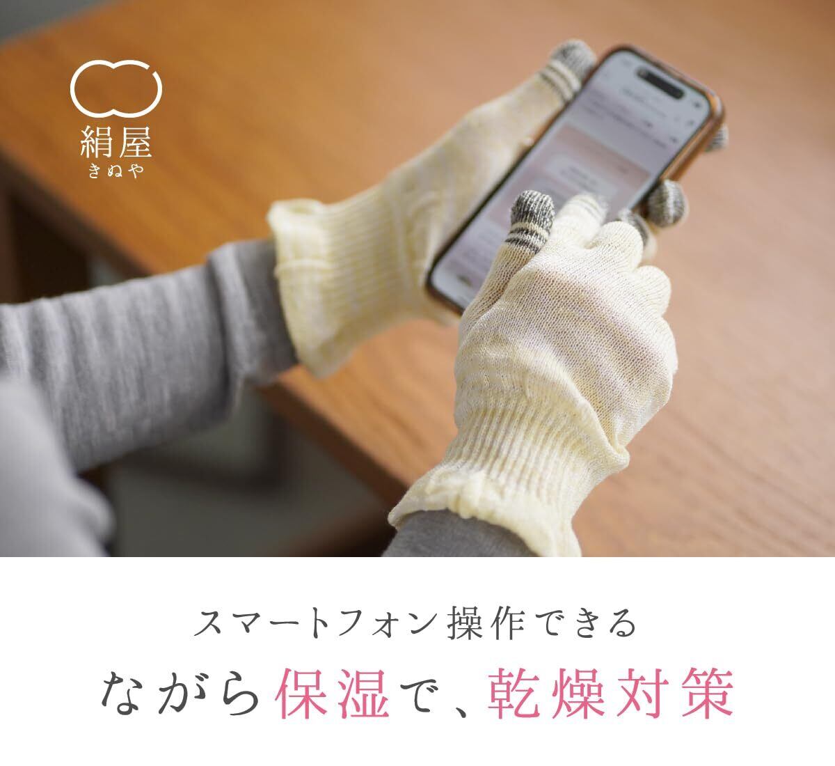 【シルク100%のスマホ手袋で、乾燥肌も便利に保湿】冬の乾燥や、日々の家事等による手荒れ。 シルク100%の手袋で、寝ている間もしっかり保湿。 スマホ操作ができる導電糸を使っているので、 普段使いに大変便利です。