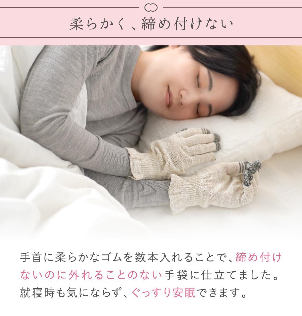 【就寝時の着用におすすめ】シルクは、手肌の保湿をしつつも、余分な汗などの湿気を吸いとり、外に放出してくれるので、就寝時の着用も蒸れずに快適。寝る前のアラームセットなど、スマホ操作ができるからこそ就寝前の準備もとっても便利です。