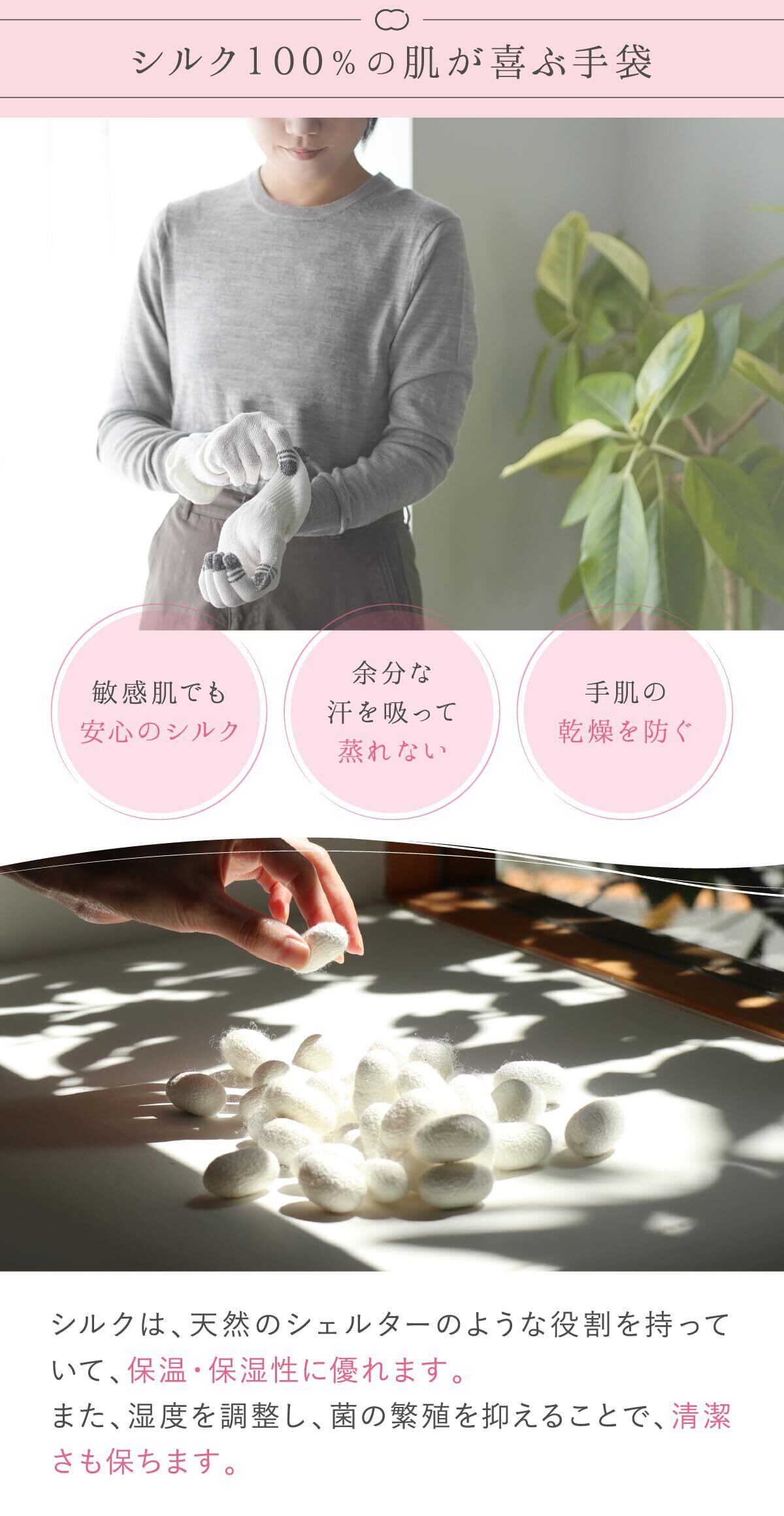 【シルクの力でしっとり保湿】<Point.1 保湿性が高く、肌に潤いを与えて乾燥を防ぐ><Point.2 人の肌と同じたんぱく質でできているから肌を傷つけにくい><Point.3 吸湿・放湿性に優れているので蒸れにくく、汗をかいても快適> シルクは「第2の皮膚」と言われるほど、人の肌と相性が良い天然素材です。シルクは非常に保湿力が高く、また最近の繁殖を抑え、肌を清潔に保ってくれるので、素肌が潤い若々しさを保つことができます