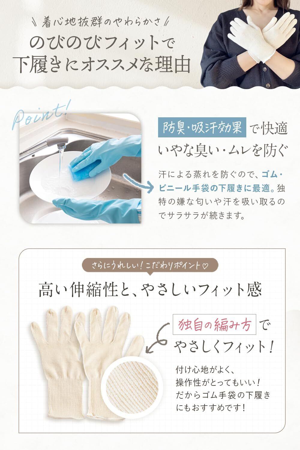 【手肌を守る、柔らかな風合い】 独自の編み方によって実現した柔らかさと伸縮性。お肌に優しく、手の操作性を妨げないの動きやすい設計。長時間の使用でも蒸れにくく快適なので、おやすみ手袋としても。手袋内部の快適さを保つため、指の股の部分に小さな穴があるなど工夫が凝らされており、少し汗ばむ季節でも熱がこもりづらく、サラサラしています。良く伸びるので女性の方だけでなく、手の小さめの男性の方にもご着用頂けます。