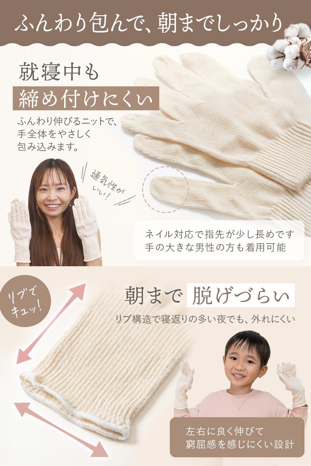 【締め付け感が少ないので、ナイト手袋におすすめ】 寝る時の手の締め付け気になりますよね。当店のスキンケアグローブは締め付け感が少なく、自然なフィット感。つけているのを忘れるくらい馴染むので、ナイト手袋としてご活用頂けます。一晩中快適な着け心地で、お肌を守りながらリラックスした眠りをサポート。夜間のお肌ケアに、この柔らかな手袋をぜひお試しください。日常に溶け込む、肌思いのスキンケアグローブです。