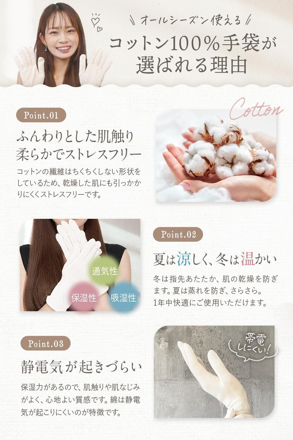 【デリケートなお肌の方にも優しいコットン100%】 手肌のお悩みは、綿100%の手袋で解決!デリケートなお肌の方に最適な、100%コットンの手袋。天然素材ならではの優しい肌触りで、お肌への刺激が少なくチクチクしません。肌触りがよいので敏感肌の方でも安心してご使用いただけます。手を優しく包みこむので、一日中快適な着け心地を提供します。お肌への負担を最小限に抑えたコットン手袋です。