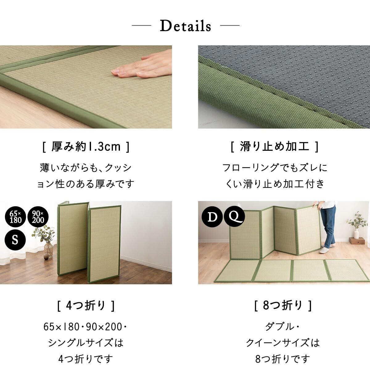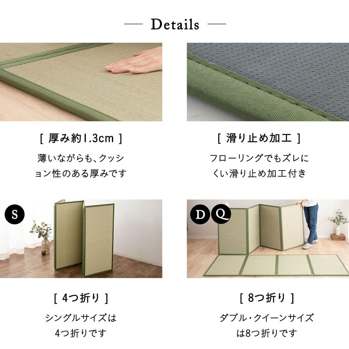 【素材】本体:天然い草100%(双目織)/裏面:ポリプロピレン(滑り止め樹脂加工) ※畳の端が白いのは、い草本来の性質によるもので、日焼けや不良ではございません。 【仕様】防カビ加工・四方縁 【製造国】中国