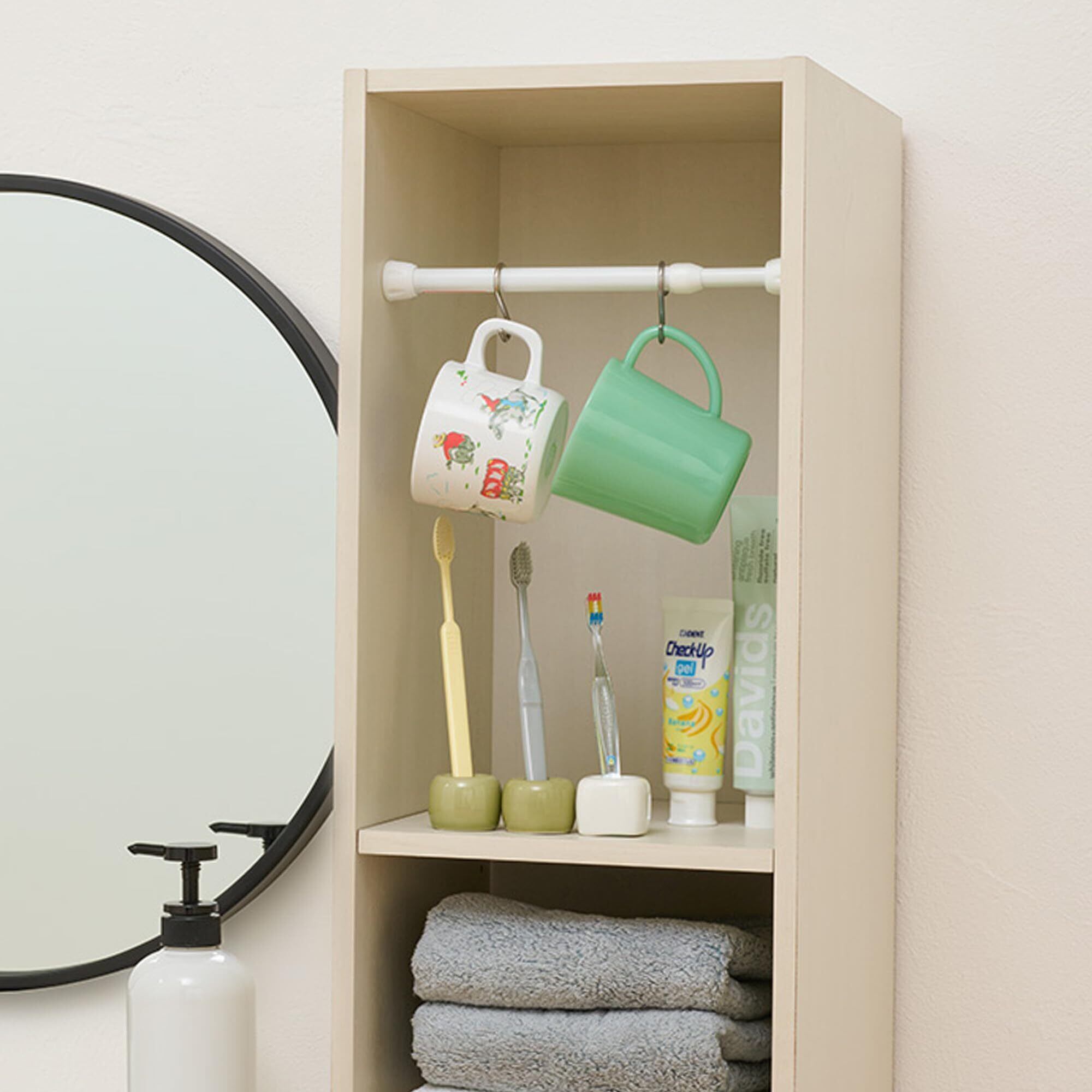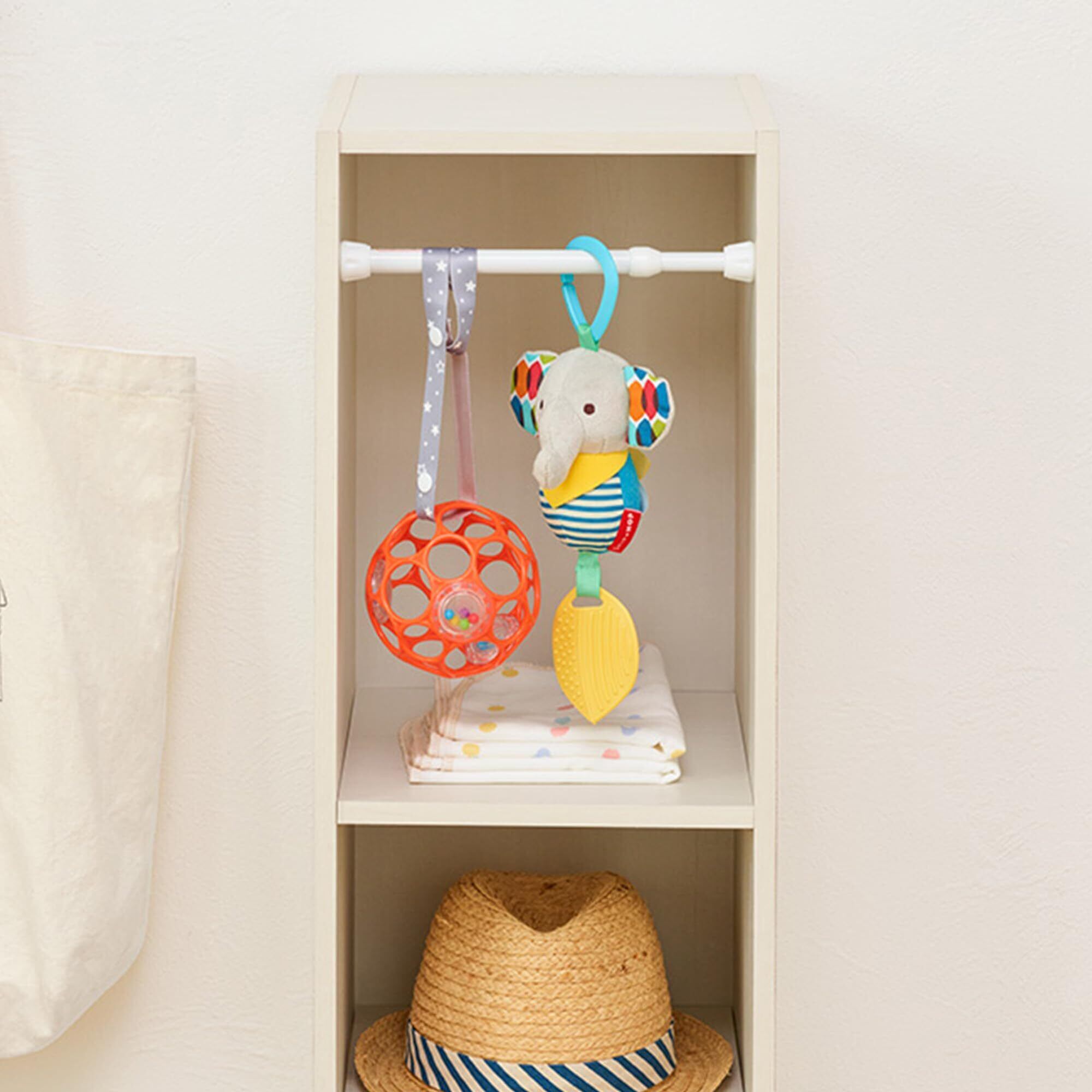 カラーボックスでの子供服収納に。棚や収納庫の空きスペースなど、幅の狭いスペースに設置できるつっぱり棒。