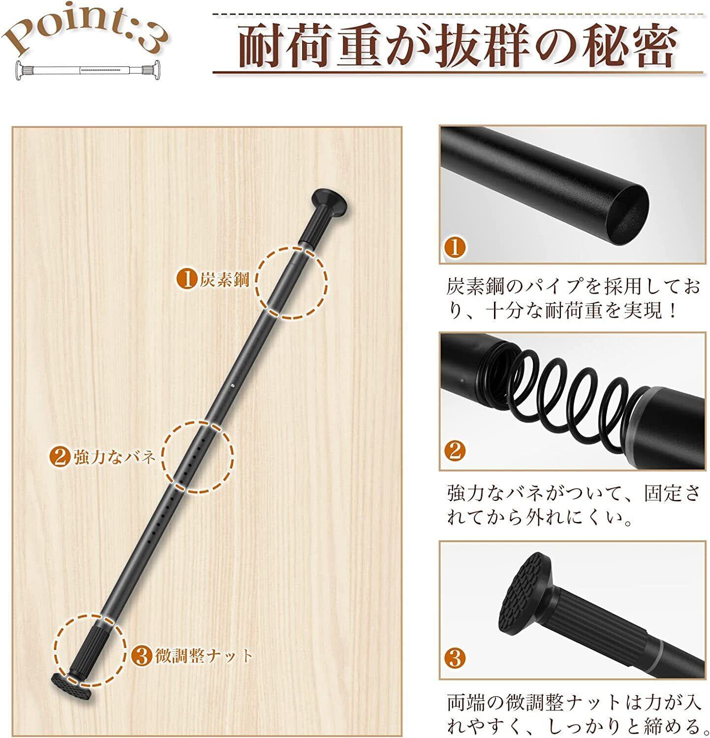 【耐荷重もバッチリ】高強度炭素鋼を採用しているつっぱり棒は耐荷重がバッチリ!本体内蔵バネには强力タイプを使用。長く伸ばしてもずれ落ちる心配がありません。大量の洗濯物も一度に部屋干し!
