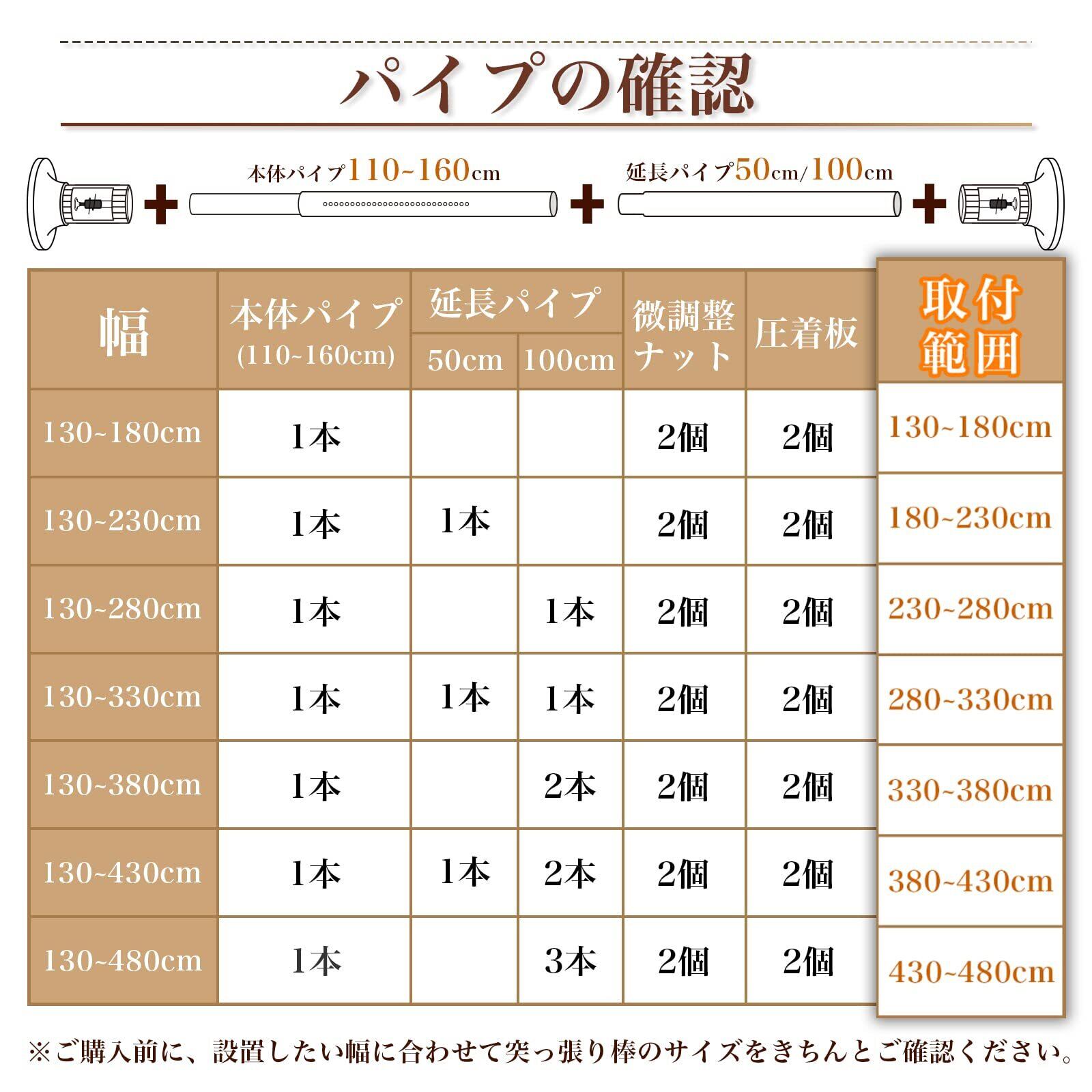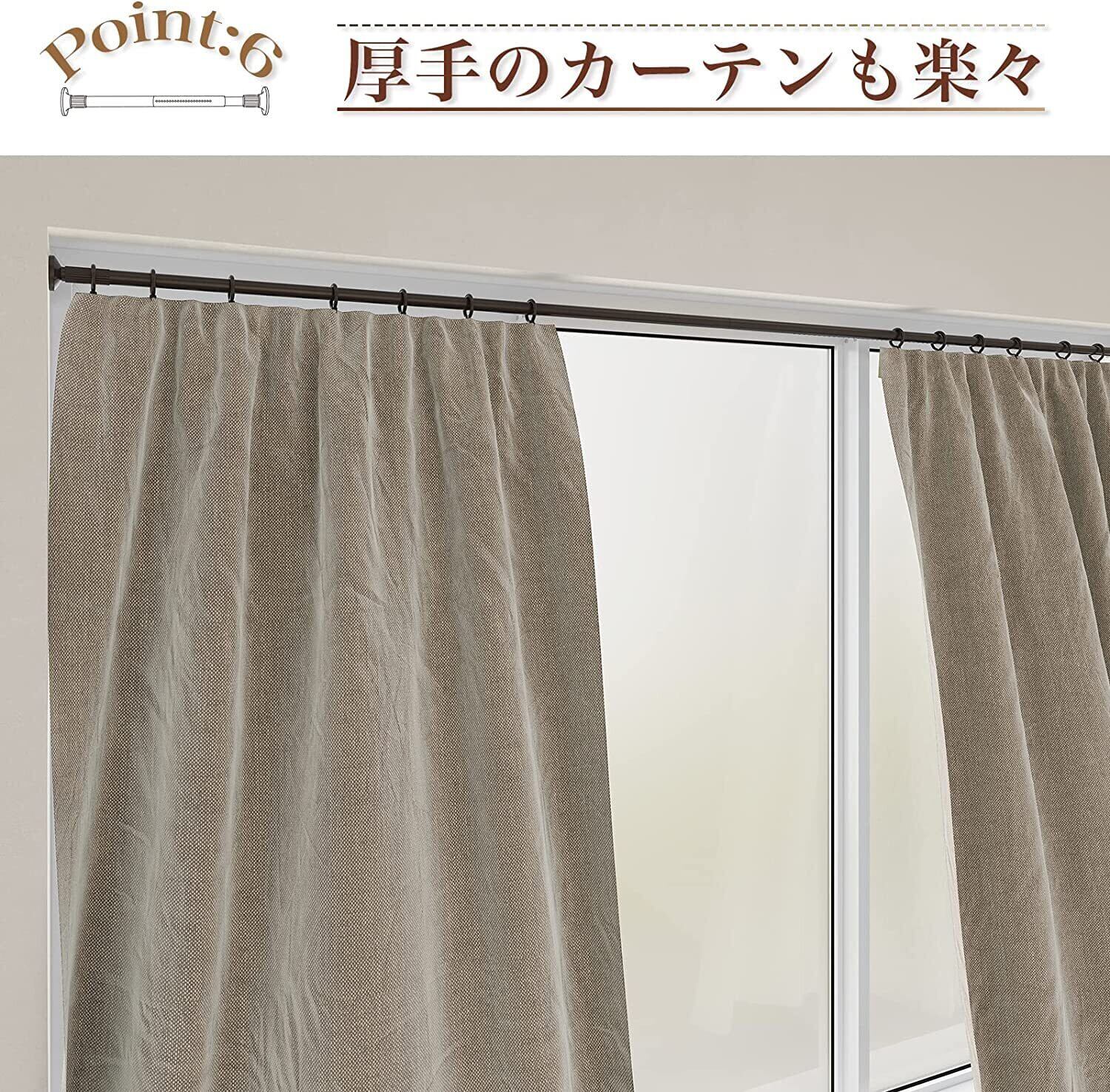 【強力つっぱり棒】パイプ直径32mm 幅130~180cm 耐荷重:約55~45kg カーテンリング20個付属