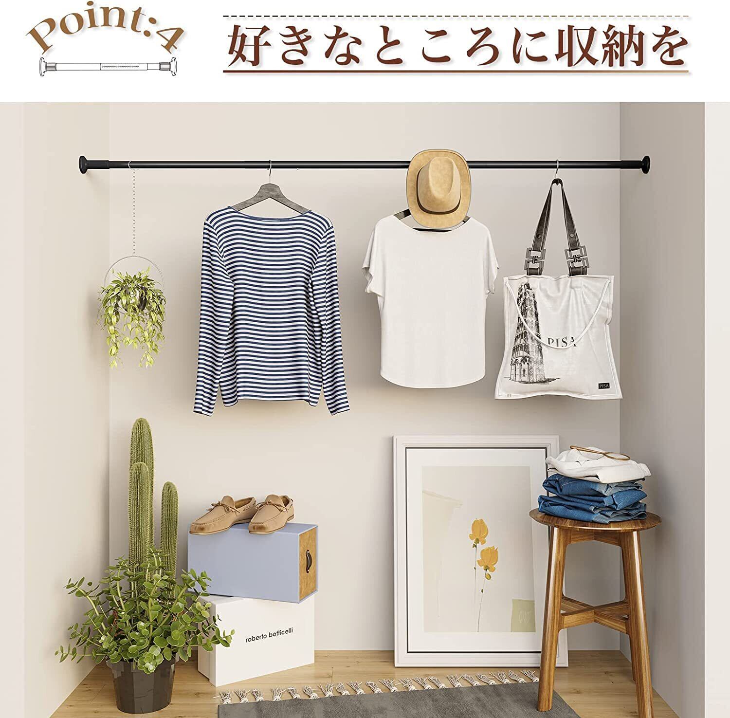 【簡単な取付け・取出し】気軽に取り付けられて、簡単に外せるのが突っ張り棒収納のメリットです。収納スペースが足りないときに取り付けて、模様替えするときなどにはすぐに外すことができます。