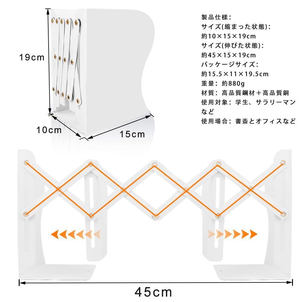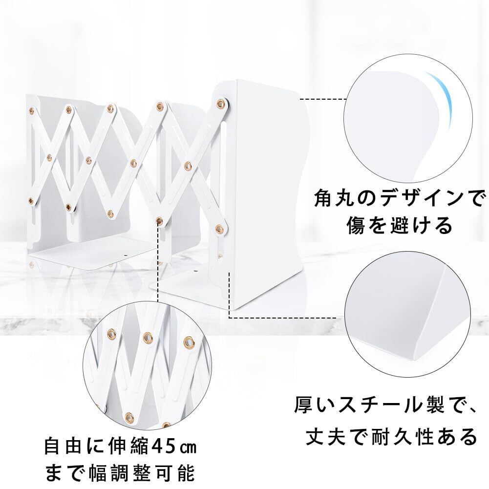 ブックエンド 2個入り 本立て 伸縮自在 卓上収納 倒れない ブックスタンド 金属製 仕切りスタンド デスク整理 (白)