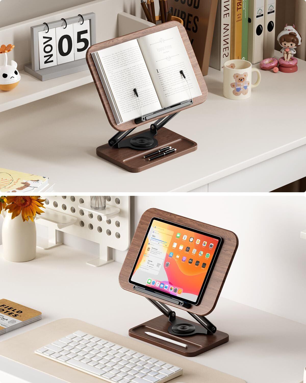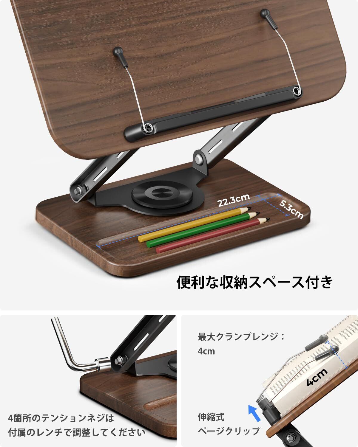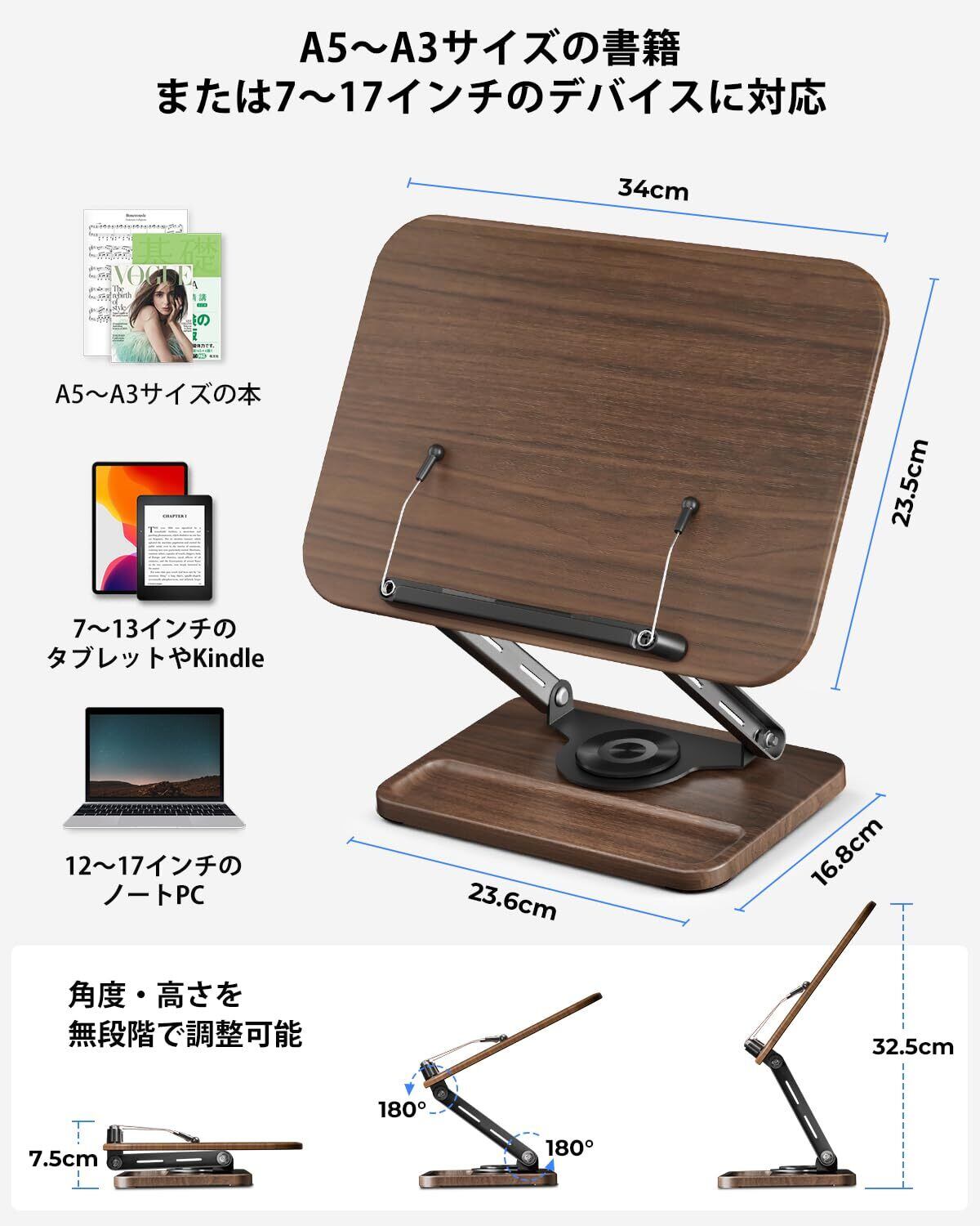 viozon 書見台 ブックスタンド 卓上 勉強 360度回転式 ペン用のくぼみ付き 無階段高さ調整 折りたたみ式 安定 おしゃれ 本立て タブレット PCスタンド ウォールナット色