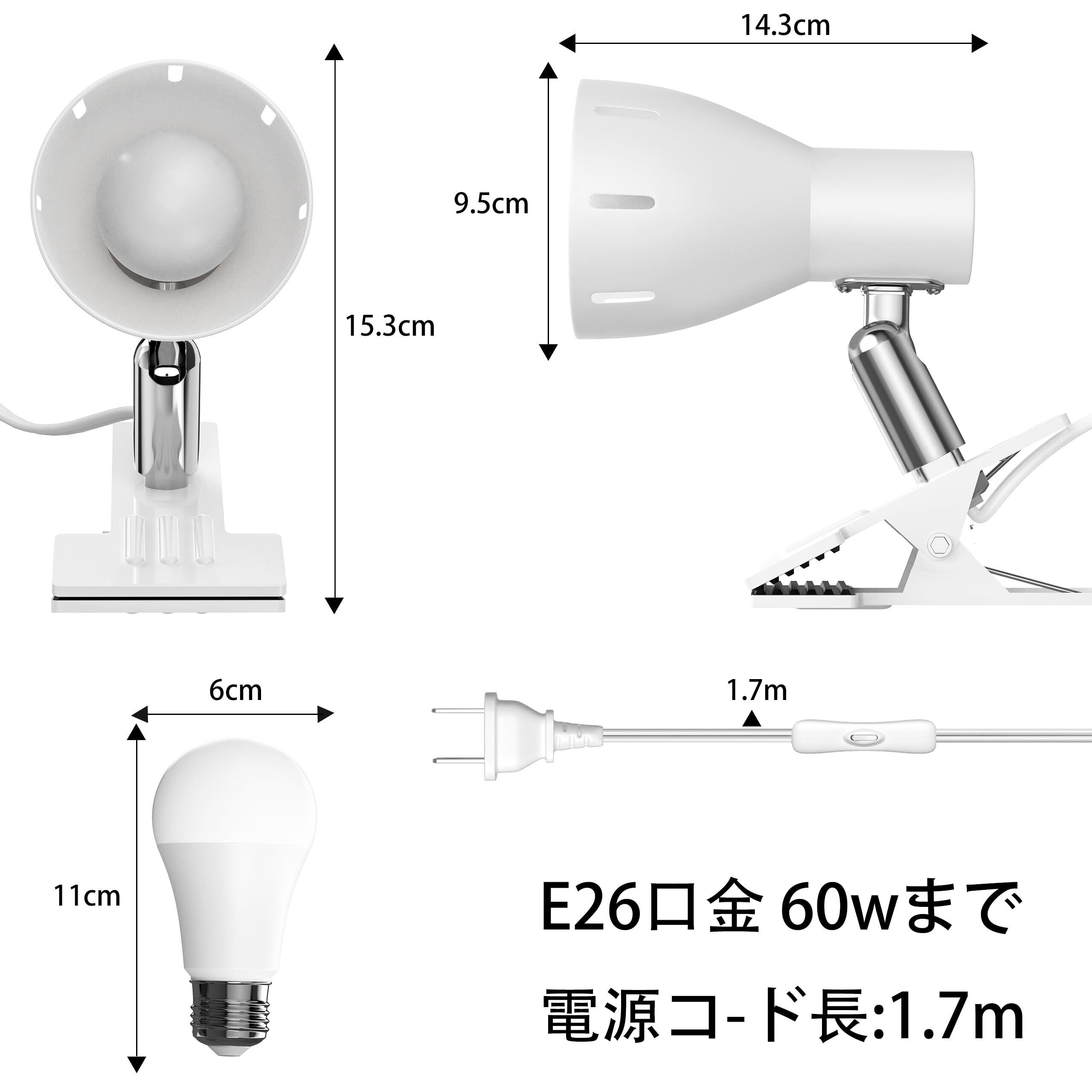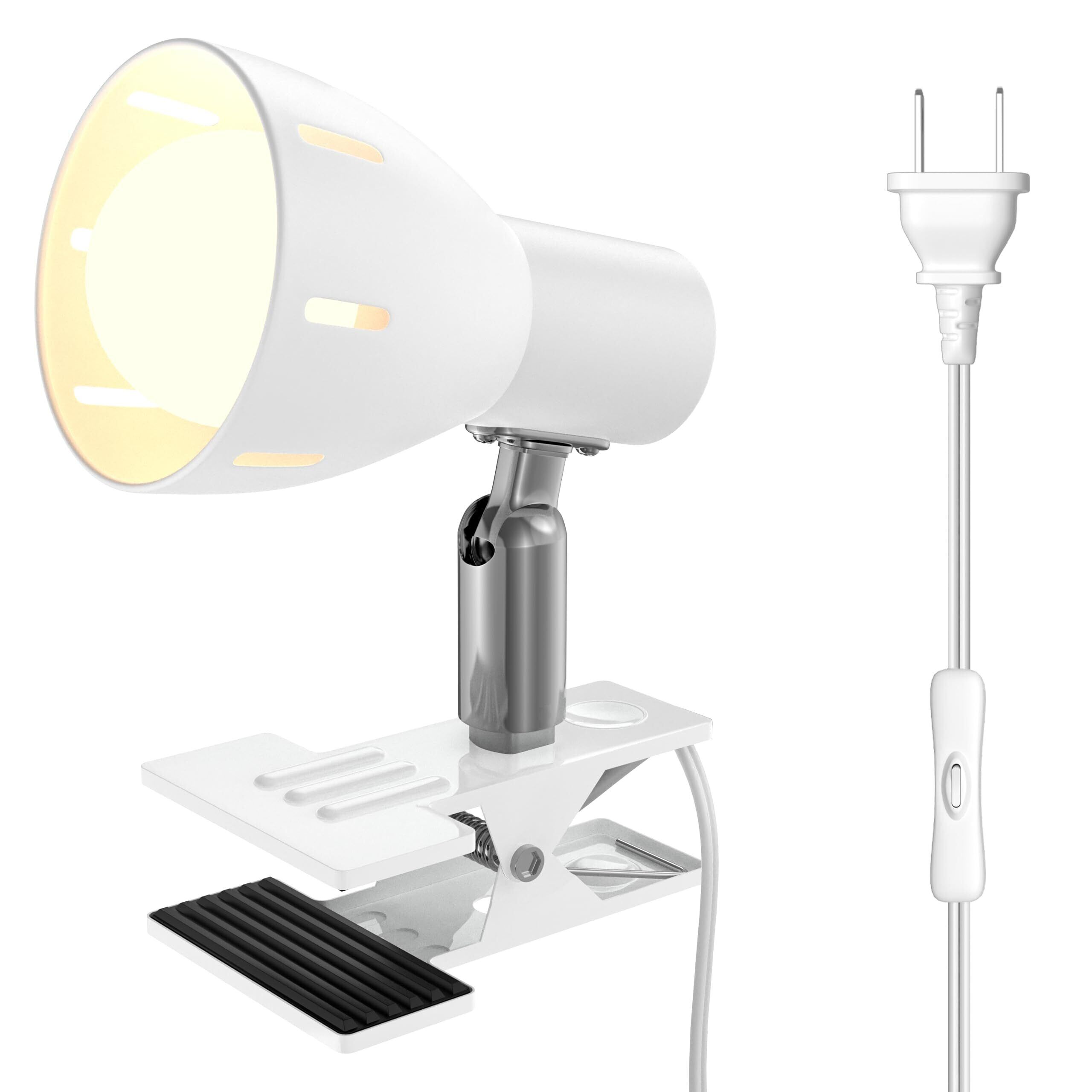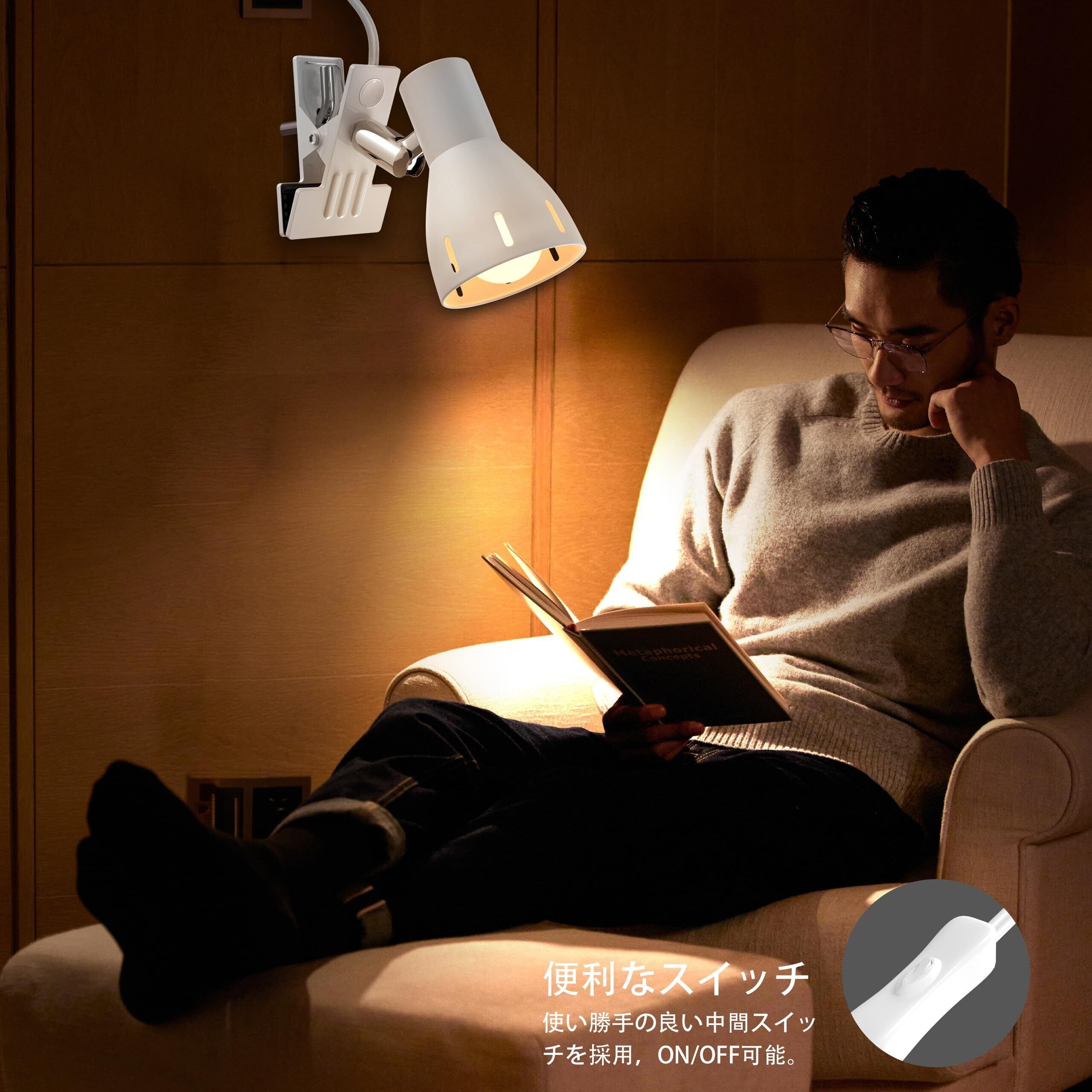 クリップランプ、E26 ランプホルダー、LED 電球 (9W,色温度3000K) 付き、屋内用、スイッチソケット付き、屋内照明、ワーク、読書作業、リビングルーム、寝室照明 (白色クリップランプホルダー)