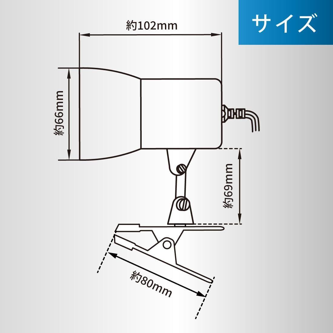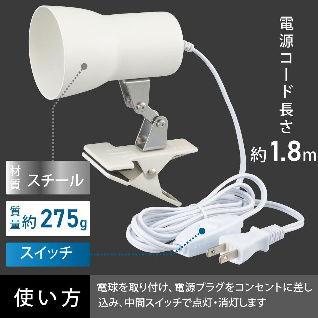 【 仕 様 】 ◆スイッチ:中間ON/OFF ◆定格電圧:AC100V 50/60Hz ◆消費電力:40W MAX ◆口金形状:E17 ◆材質:スチール ◆クリップはさみ幅:10~20mm ◆電源コード長さ:約1.8m ◆質量:約245g ◆使用電球(別売):白熱電球…40W以下、LED電球…8W以下、全長…70mm以下、最大径…35mm以下、質量…80g以下の電球をご使用ください