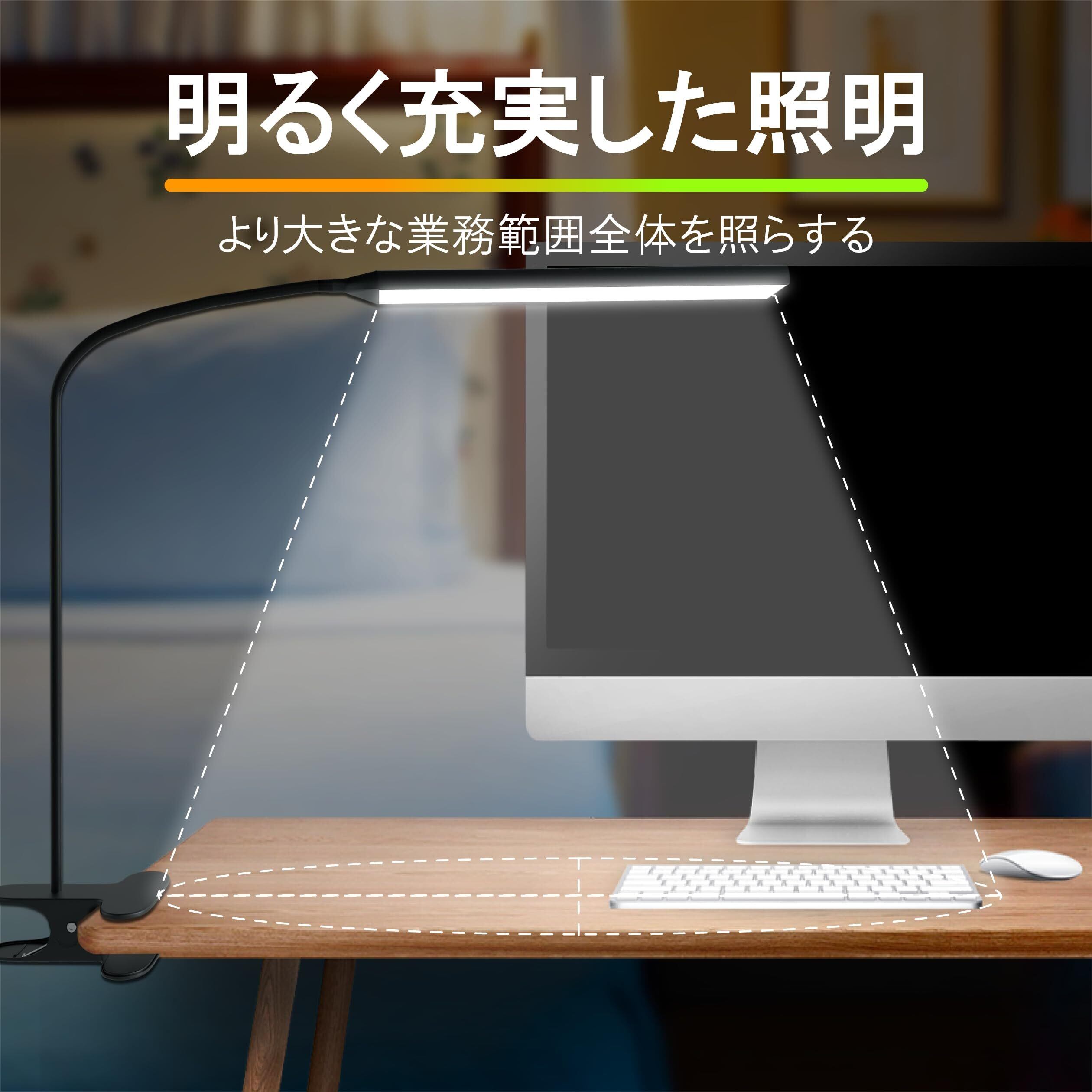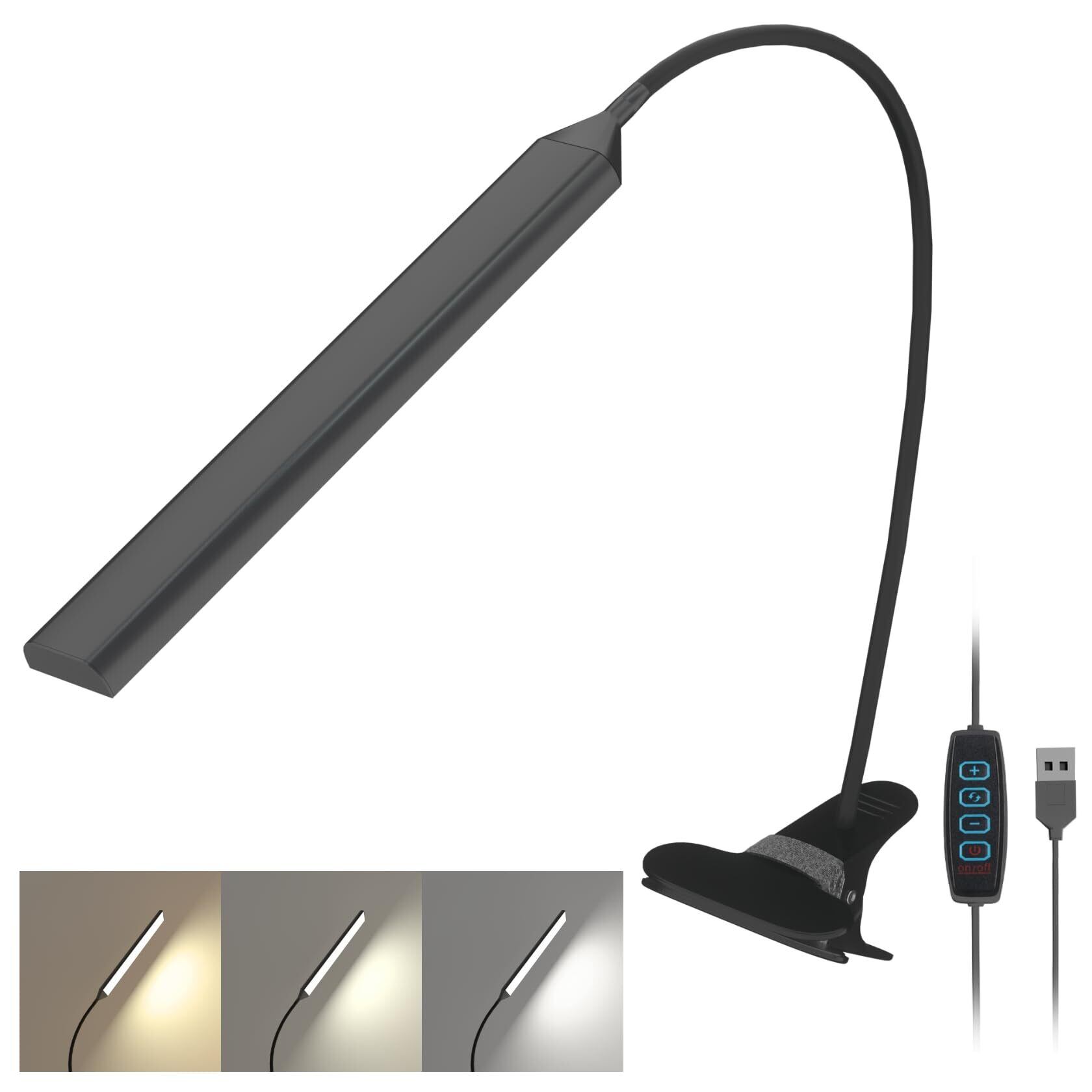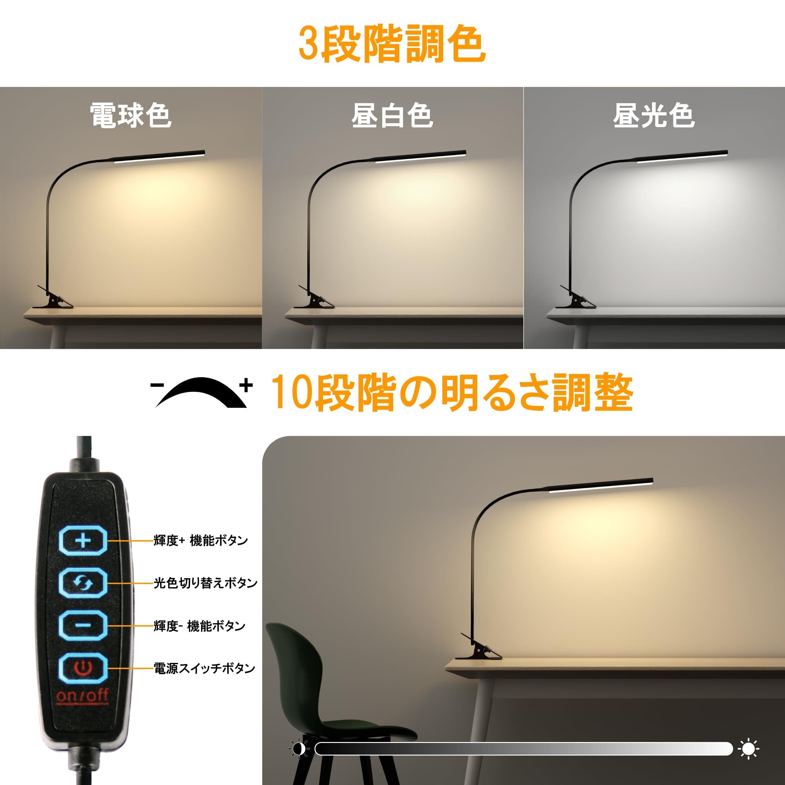 ORALUCE クリップライトLED 明るい 3段階調色 10段階調光 デスクライト クリップ 目に優しい 電球色/昼白色/昼光色 8W 800LM USB給電式 スタンドライト おしゃれ 細身 360°回転 省エネ 卓上ライト 学習机 勉強机 仕事 授乳 読書灯 ブラック