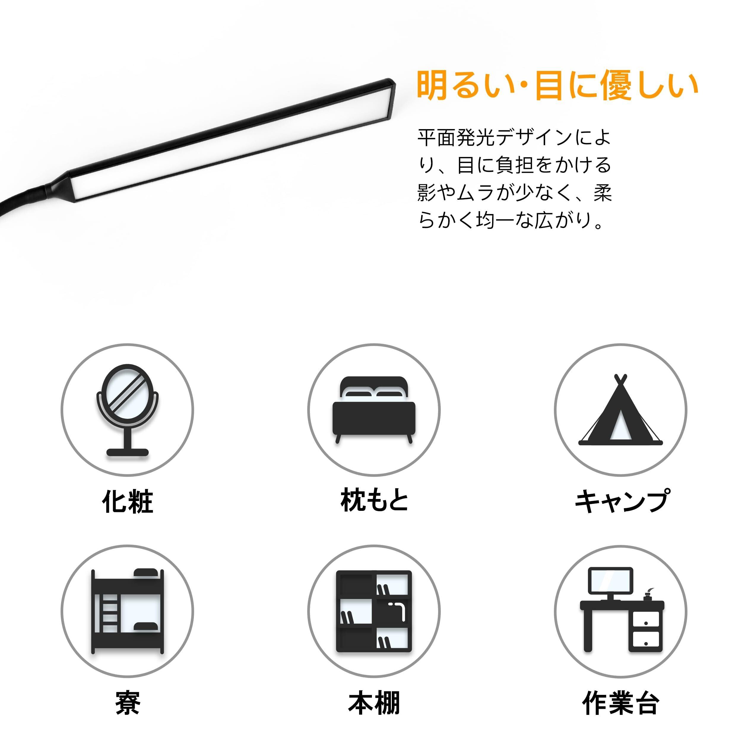【明るい・目に優しい】高品質・高輝度のLEDチップを使用し、明るさを確保しつつ省エネルギー。平面発光デザインにより、目に負担をかける影やムラが少なく、柔らかく均一な広がり。長時間の勉強や作業でも目が疲れにくい。