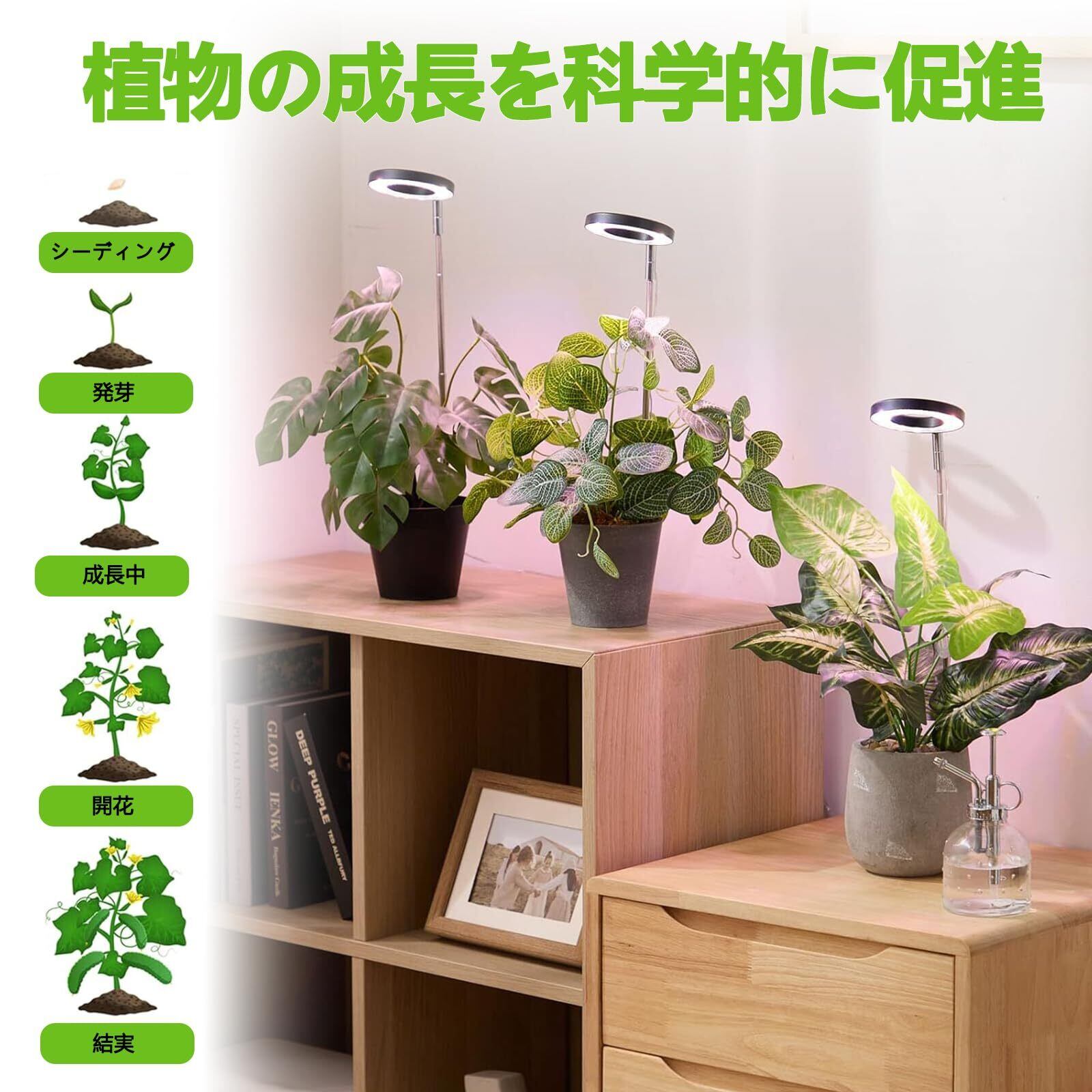 【簡単な取り付け、多用途対応】この植物用ライトは、追加のツールなしで簡単に取り付けが可能です。調整可能なポールを植木鉢に差し込んで、高さを調節し、リングライトを好みの角度に回転させるだけでセット完了。室内の花、野菜、果物、多肉植物などに幅広く対応し、開花期間の延長や果実の成熟、さらには多肉植物の健康的な成長をサポートします