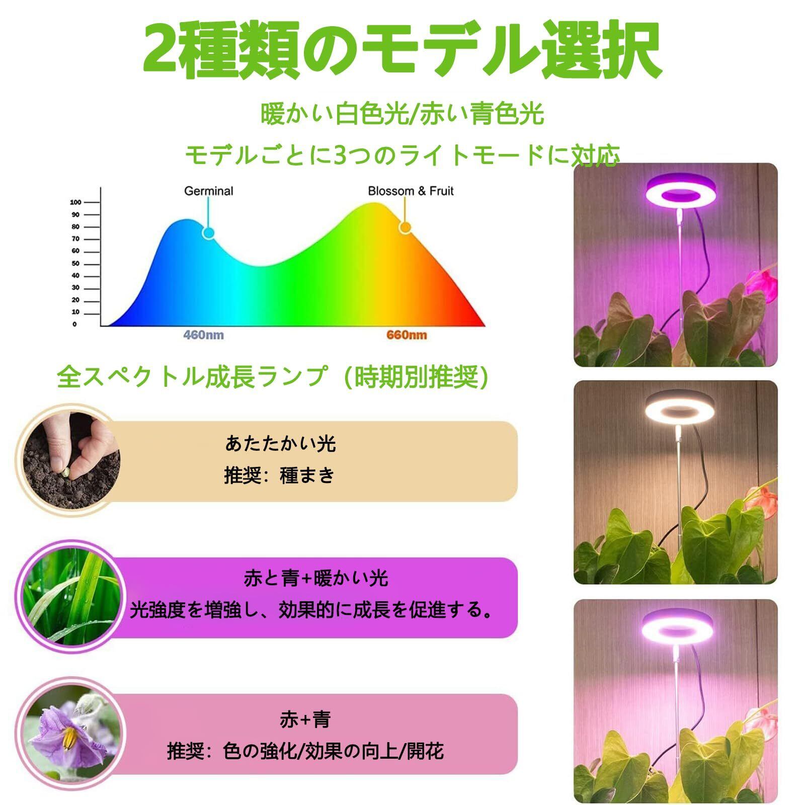 【三つの光モードで植物の成長を科学的に促進】この植物用ライトは、赤色光、青色光、赤青混合光の三つのモードを備えています。赤色と青色の光は、花や果実、葉の成長を促進し、暖かい白色光は栄養と構造の成長を促します。これらのスペクトルは科学的に研究されており、植物の成長段階(苗、成熟期、開花期)に応じて最適な照明を提供します