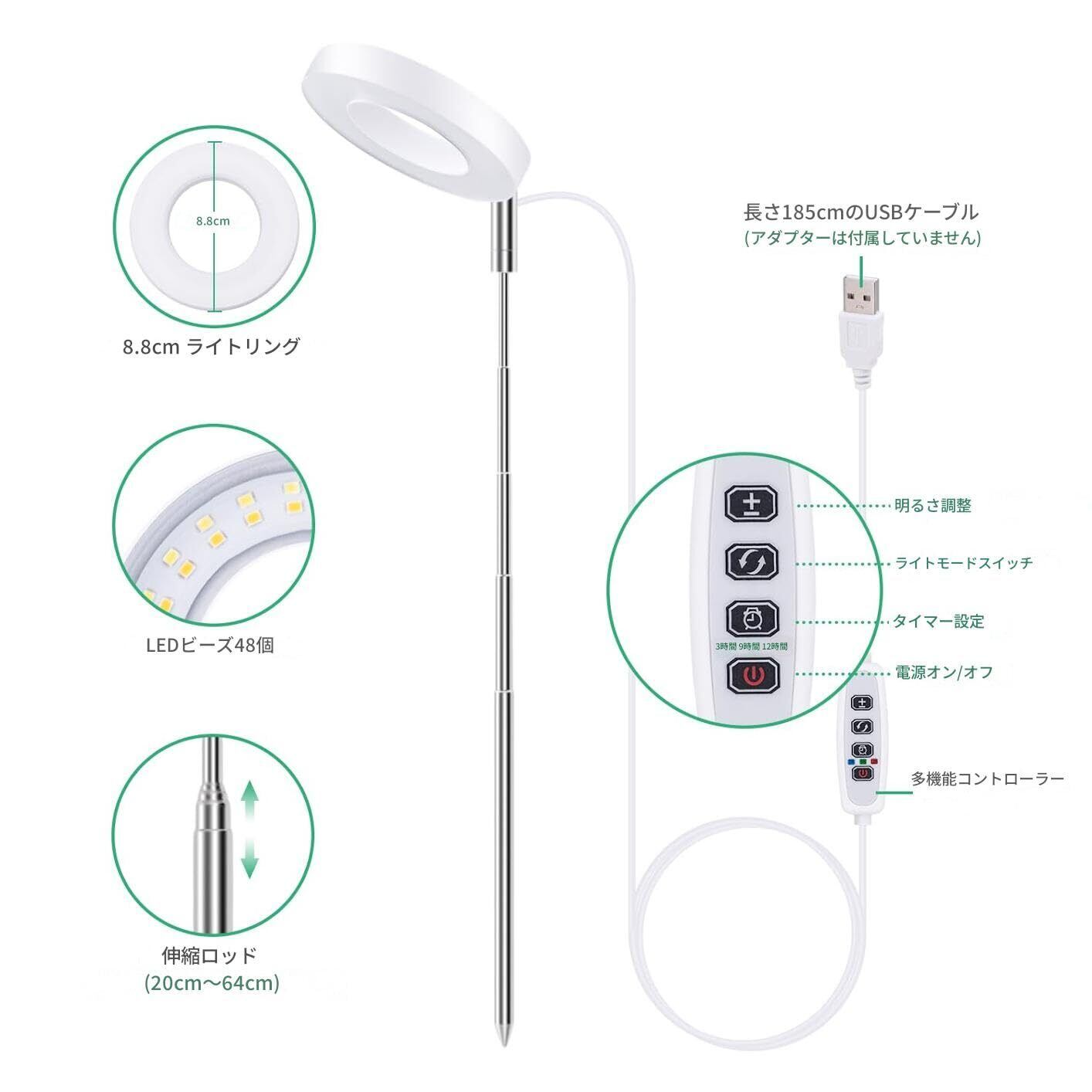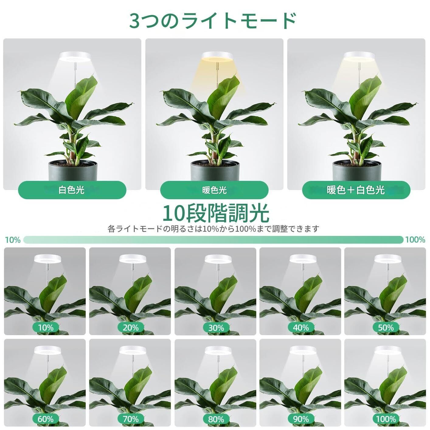 育成ライト 植物 led 高さ調節可能 設置簡単 3段タイマー(3/9/12時間)10段階調光 3種類の光モード(電球色、昼白色、白色)ランプヘッド角度調整180 LED USB給電 太陽光模擬 低消耗 省エネ 自立式スタンドタイプ 室内用 水耕栽培 多肉 野菜 植物工場など適合する 蔬菜大棚水培灯 (温白色光)