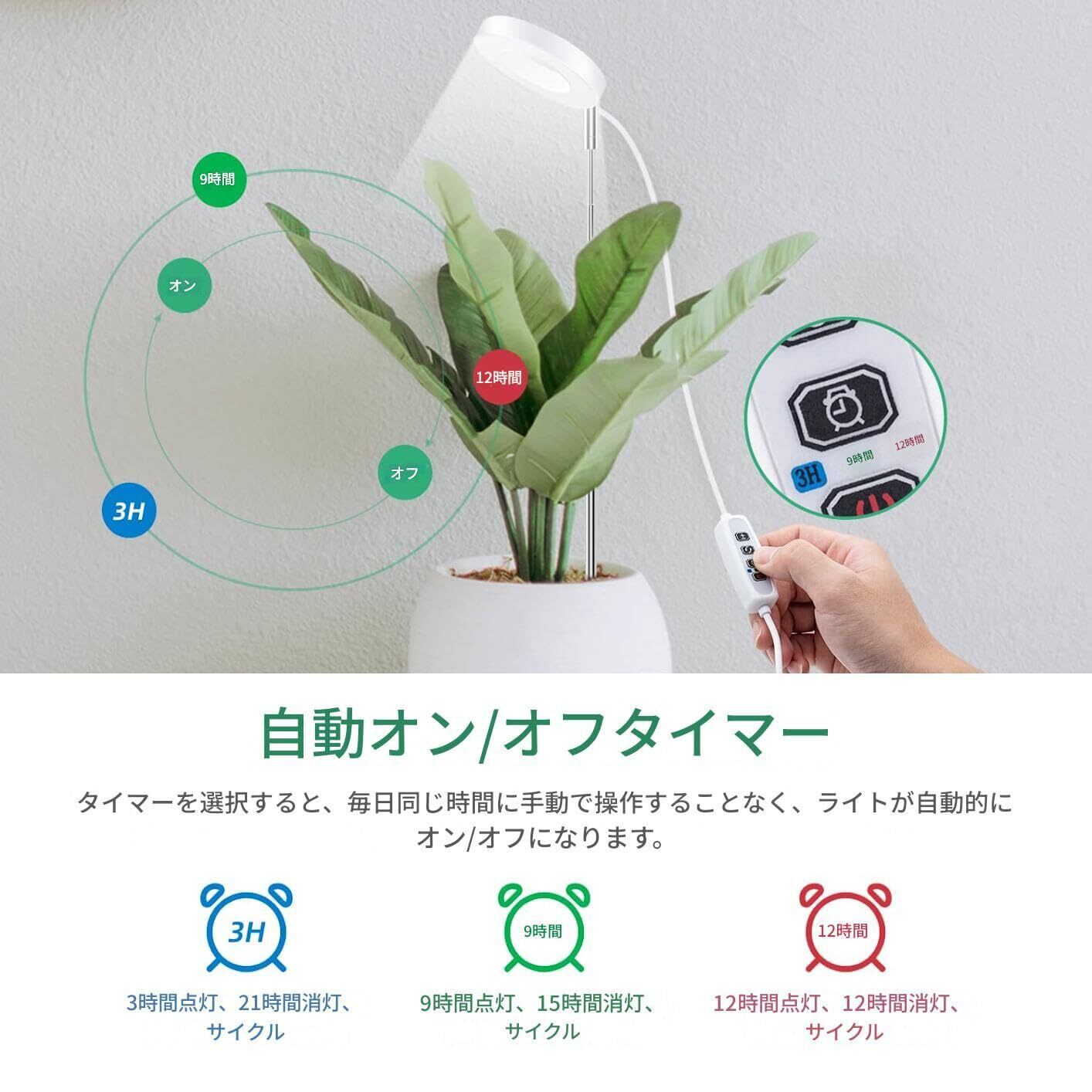 【サイクリック・タイミング機能】観葉植物 ライト3つのループタイマー設定で3/9/12時間、植物による光加減によって異なる時間を設定できます。一度設定でき、毎日自動的にオンとオフになります。 毎日設定する必要はありません。これにより、仕事中や休暇中でも、手作業で植物の世話をする必要がなくなる。注意:充電不可、タイマー機能使用時電源を入れてください。
