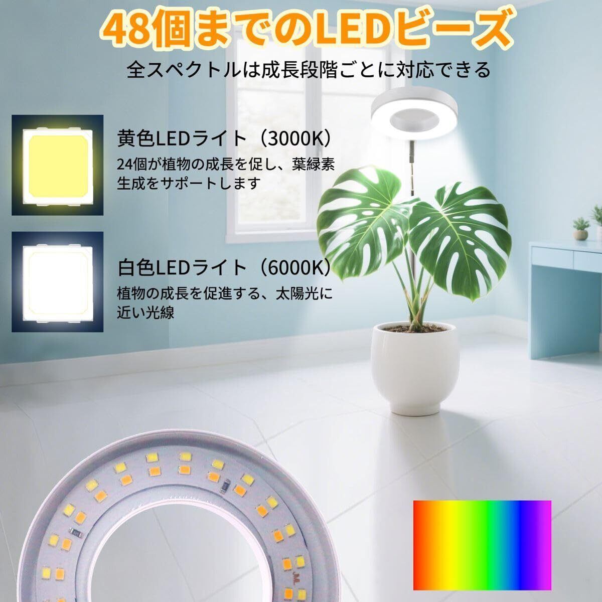 [自然光に近い全光スペクトル] 48個の高輝度LED搭載で、太陽光を再現した光を発光。植物の発芽・育成・開花までサポートし、日照不足の屋内でも健康的な成長を促します
