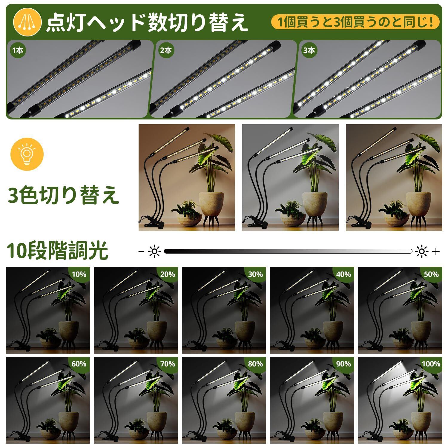 【3つに対して1つ・優れたお買い得品】植物育成ライトは、ランプの数を自由に切り替えることができ(1-3本自由切り替え)、1つ買うと3つのモデルを持っているのと同じで、市販の固定数のランプよりもはるかに経済的です。白色光、暖色光、白色光+暖色光の3つのモードと、どのモードでも調整可能な10段階の明るさで、あらゆる成長段階の植物のニーズを正確に満たし、価格性能比が非常に高いです。