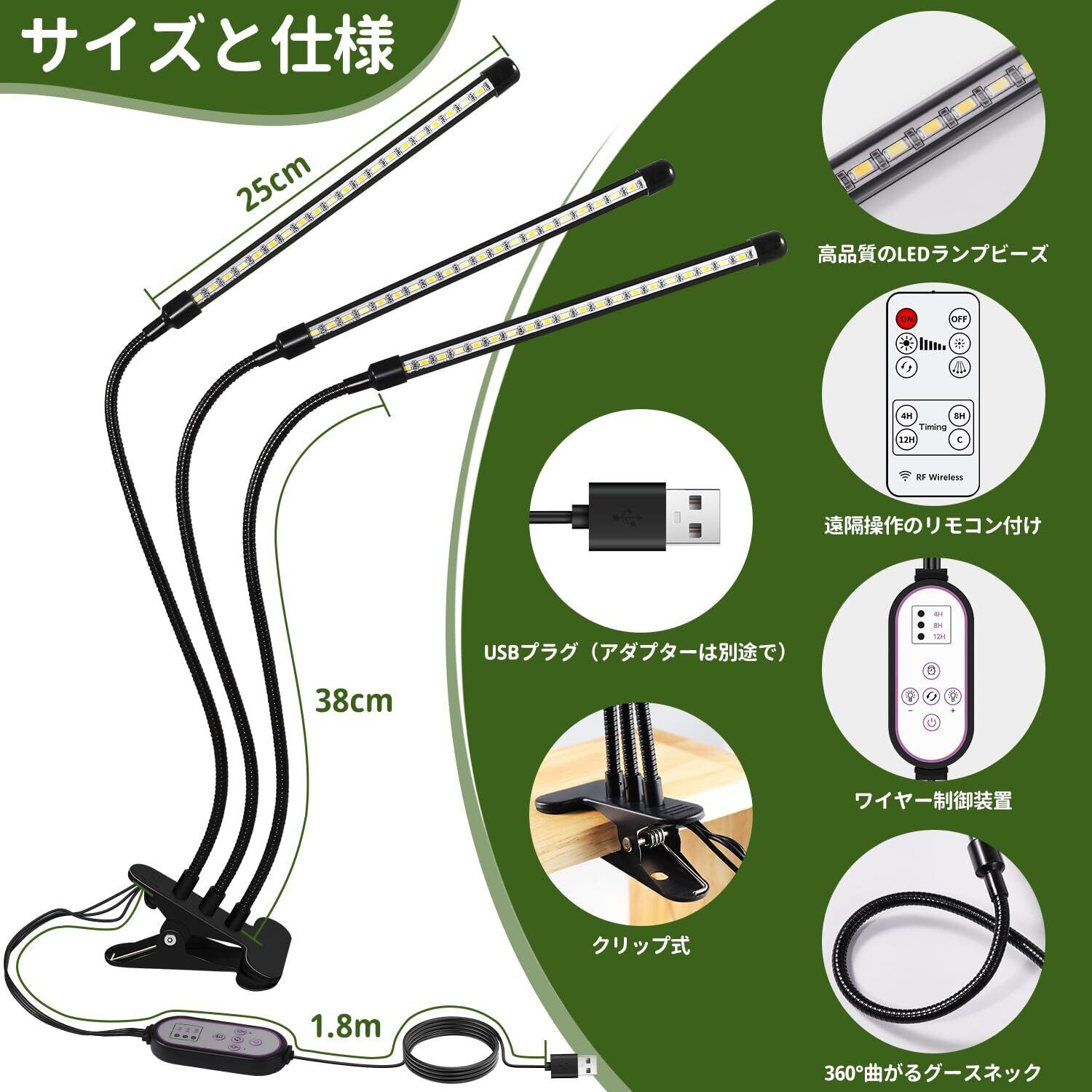 注意:植物育成ライトにはアダプターは付属していませんのでご注意ください。 5V2A/5V3Aのアダプターが適しているが、5V3Aのアダプターがよりおすすめです。